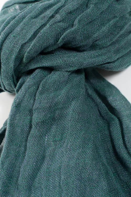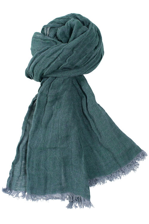 Cieniutki szalik lniany o kolorze szarej morskiej zieleni, wykończony strzępionymi brzegami - frędzelkami o długości 2 cm. Modny i elegancki dodatek na wiosnę i lato.