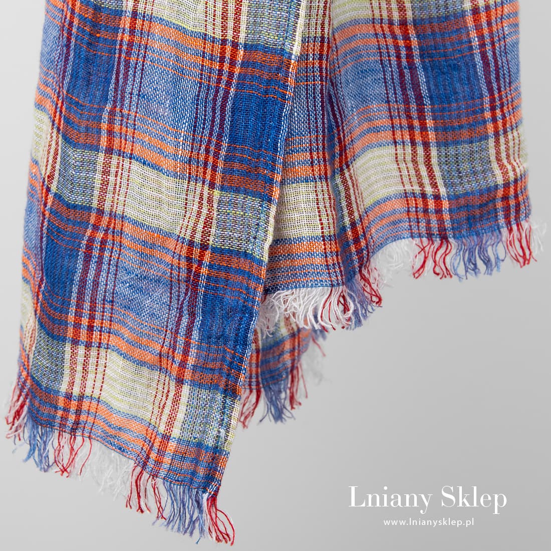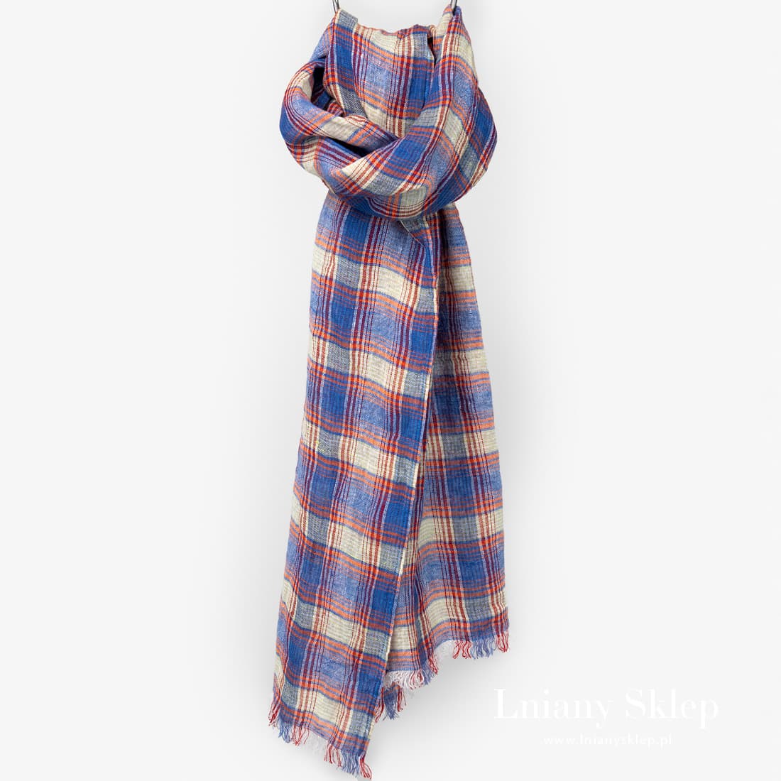 - Niebieski szalik wytkany w dużą kratkę.