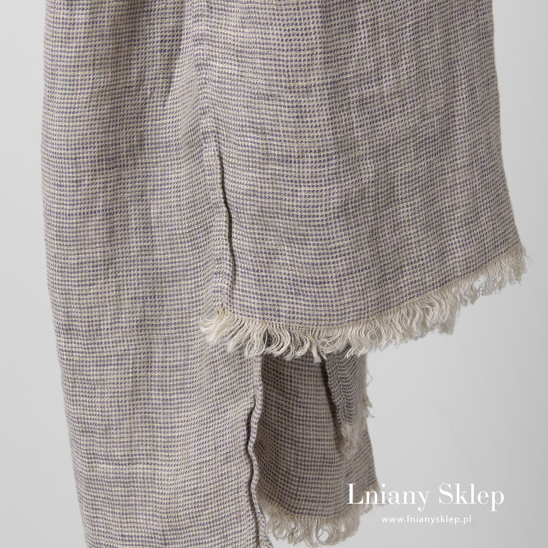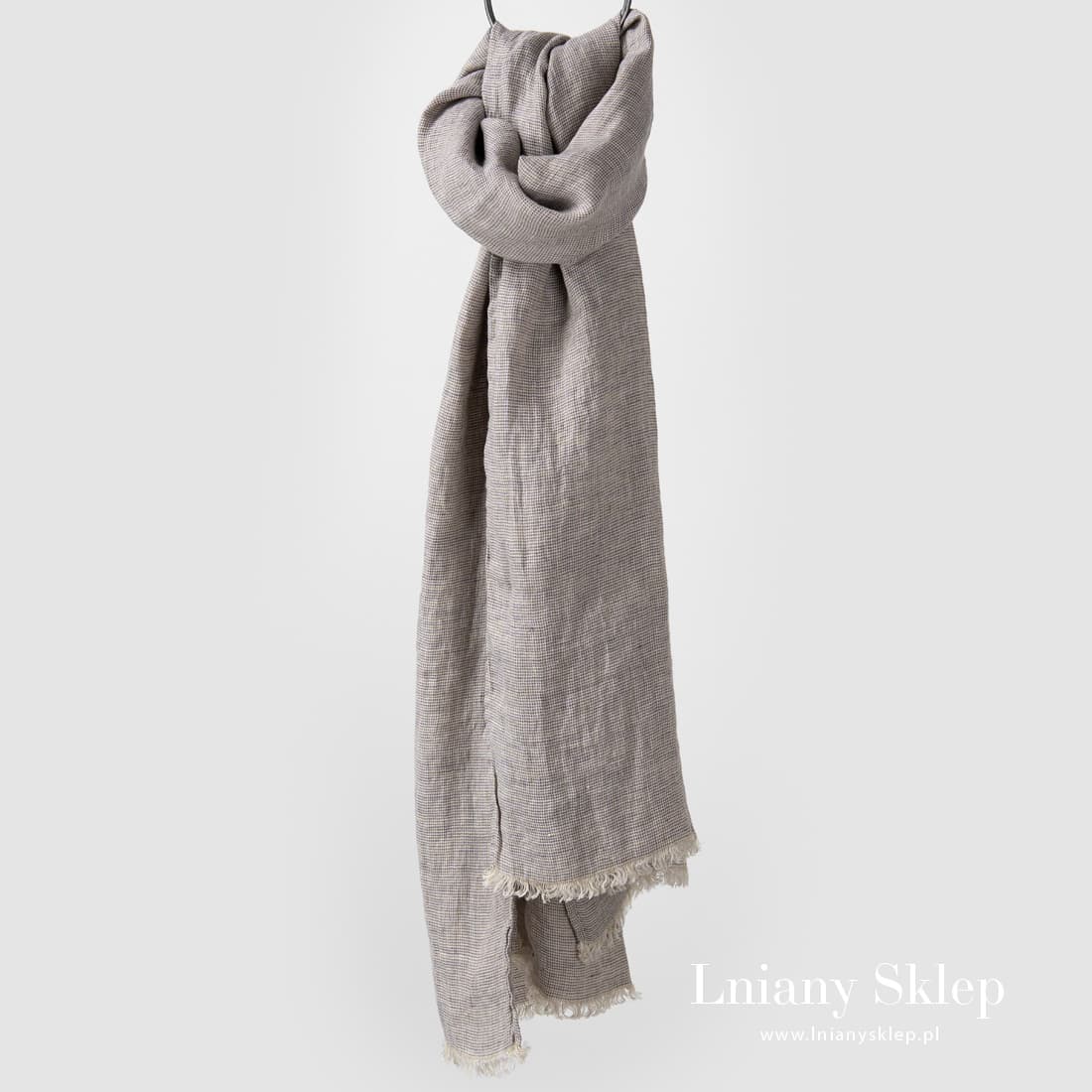MEINO szarawy szalik lniany z frędzelkami 2cm na węższych brzegach. Szalik z pranego - miękkiego i przytulnego lnu wytkanego z przędzy lekko piaskowej, zielonej, fioletowej i liliowej. Przytulny szalik lniany.