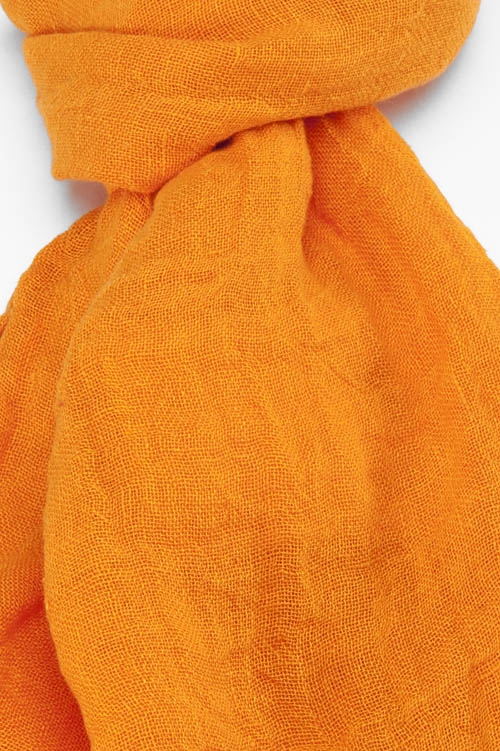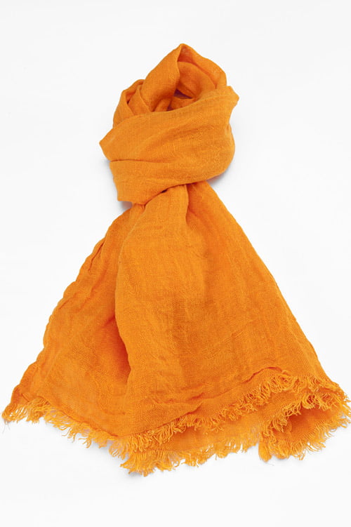 Cieniutki pomarańczowy lniany szalik wykończony strzępionymi brzegami - frędzelkami o długości 2 cm. Modny i elegancki dodatek na wiosnę i lato.