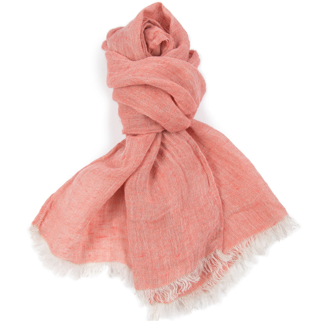 Lniany melanżowy szalik wytkany z przędzy niebarwionej (szarej) oraz różowej. Krótsze brzegi szalika zdobią szare frędzelki. Szalik jest delikatny i przytulny, ponieważ uszyliśmy go z pranego lnu. Mięciutki szalik z różowego lnu dopasuj do wiosennej albo letniej kreacji.