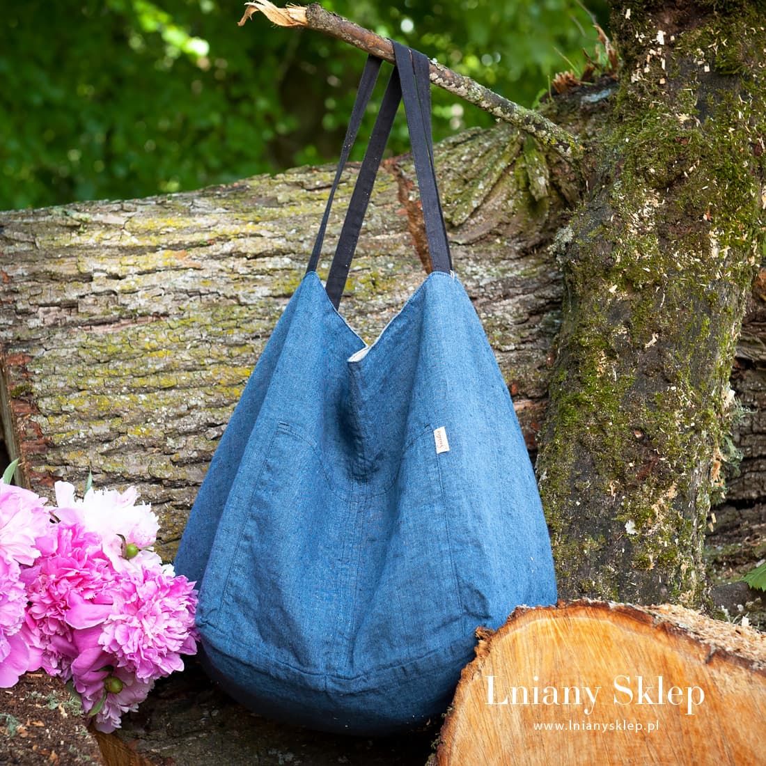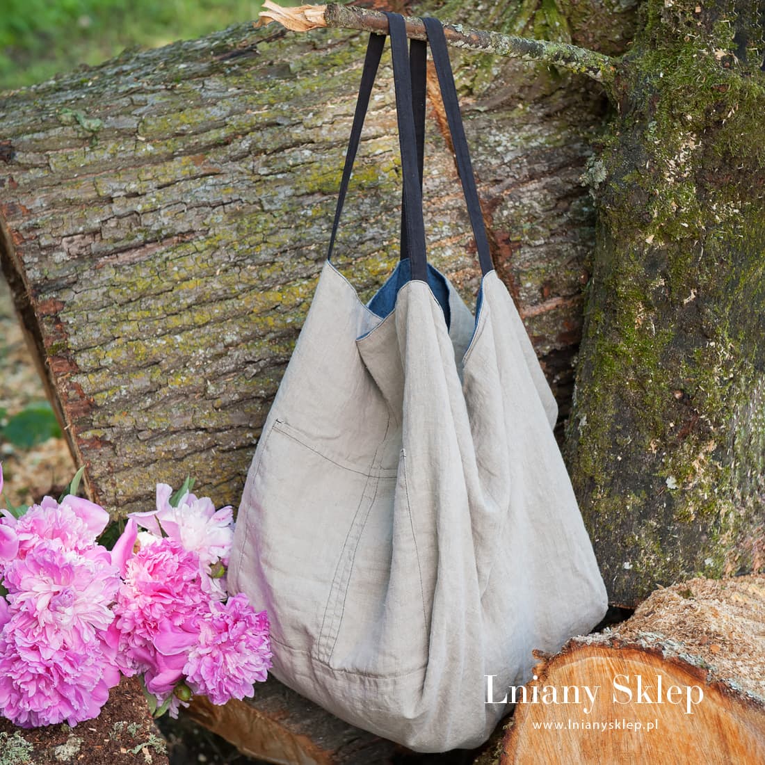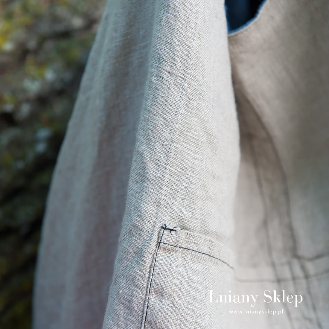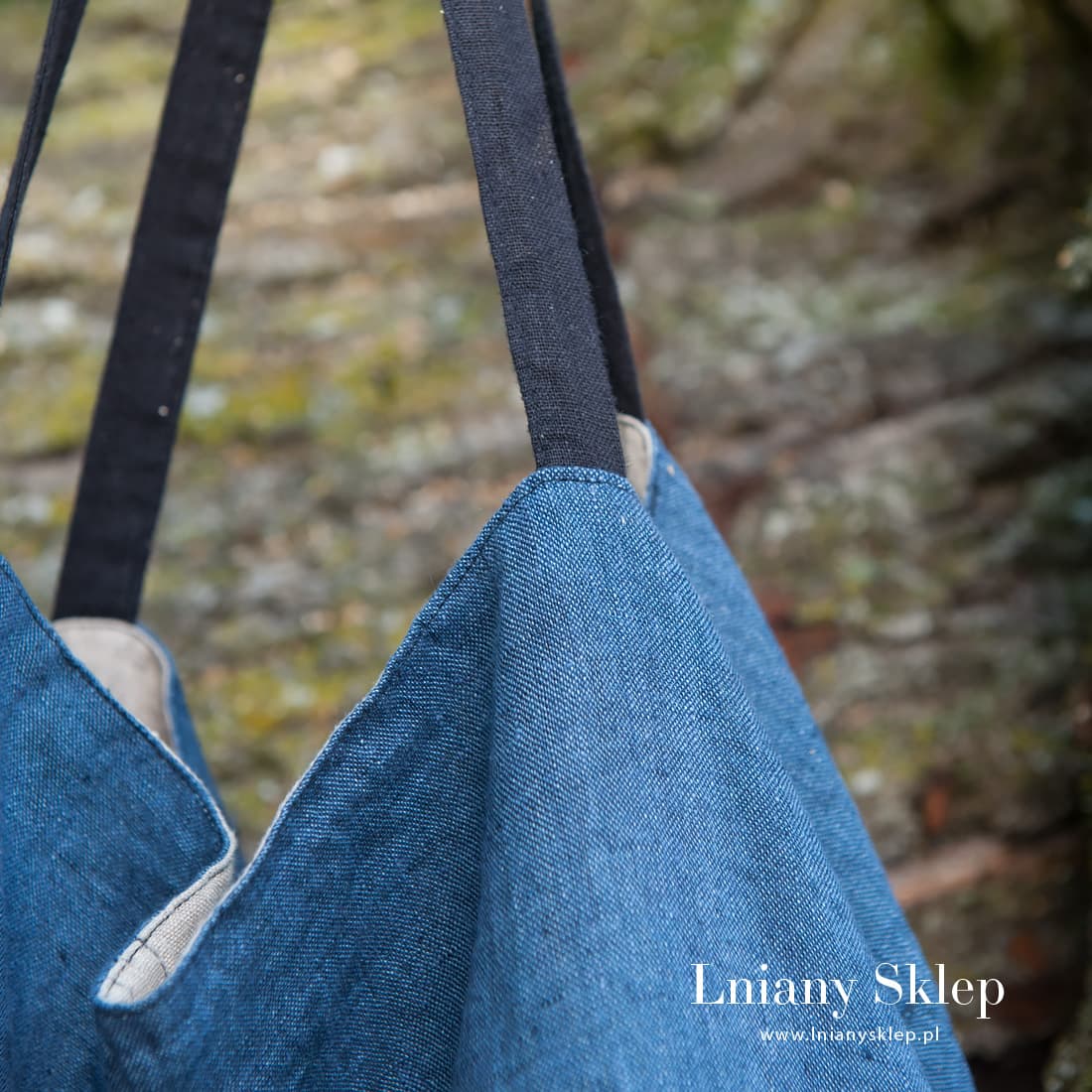 Dwustronna torba z pranej tkaniny lnianej: na zewnątrz jest ciemnoniebieska, od wewnątrz – w kolorze niebarwionego lnu. Można torbę wywrócić na zewnątrz – jasną stroną na górę. Obydwie strony torby (jasna i ciemna) są wyposażone w kieszenie. Obydwa ucha torby długie po 47cm są uszyte z czarnej tkaniny. Wygodną, pakowną torbę po wywróceniu na odpowiednią stronę, można dopasować do różnych kolorystycznie strojów.