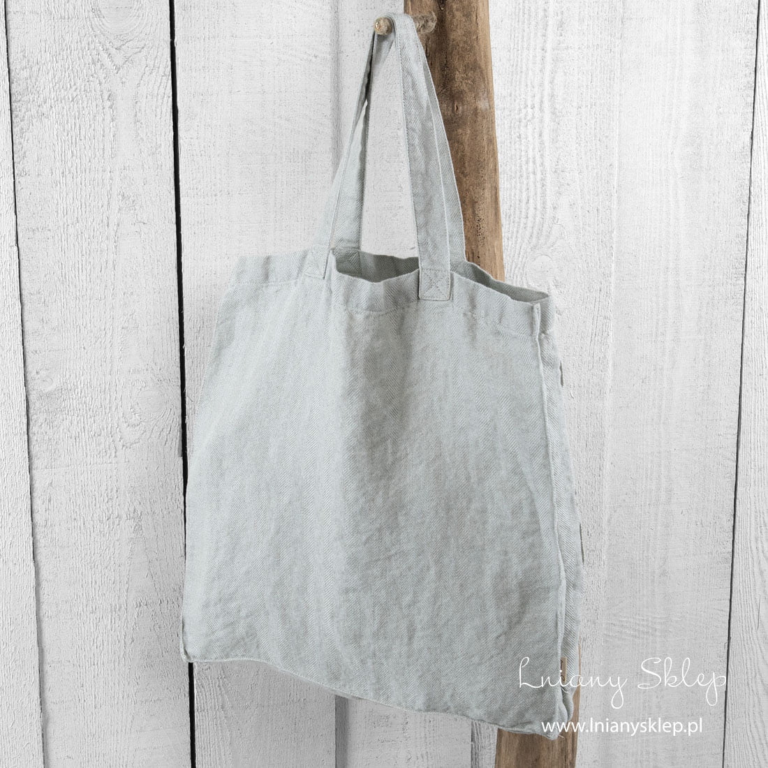Jasna torba prany len z tkaniny wytkanej splotem jodełkowym z przędzy niebarwionej i jasnej o odcieniu morskim (niebiesko – zielonym). Ramiączka długie 46cm. Wygodna torba wielokrotnego użytku z tkaniny 100% lnianej na spakowanie zakupów oraz różnych drobiazgów: książek, butów sportowych i in.