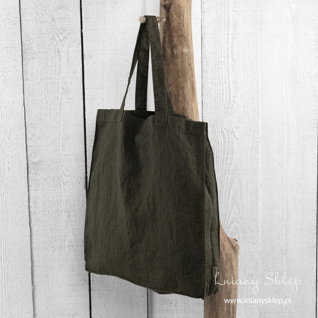 Lniana torba ciemne khaki z pranej tkaniny. Ramiączka długie 46cm. Wygodna torba w modnym kolorze z tkaniny 100% lnianej na spakowanie zakupów oraz różnych drobiazgów. Zrezygnuj z reklamówek plastikowych, zdecyduj się na lnianą torbę wielokrotnego użytku.