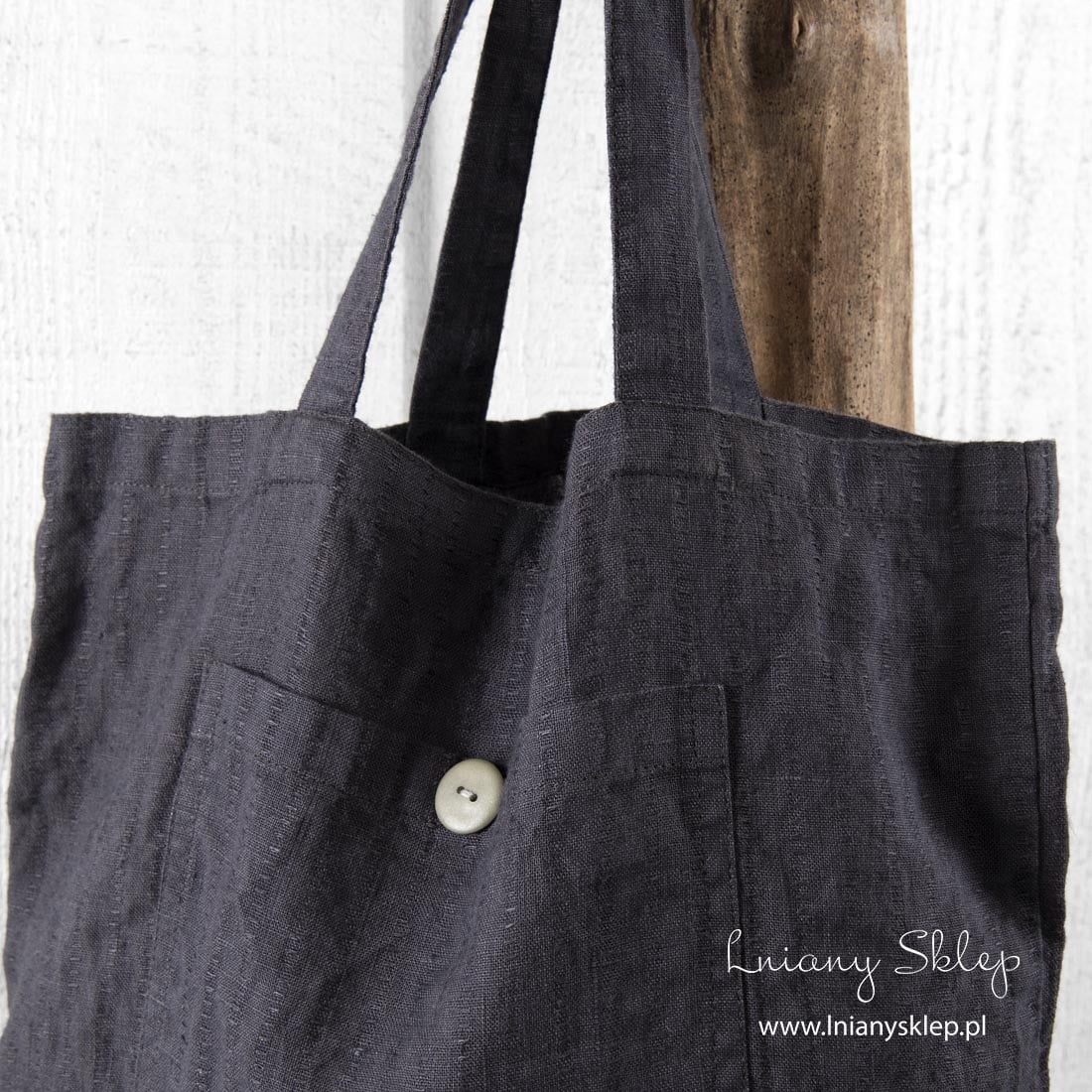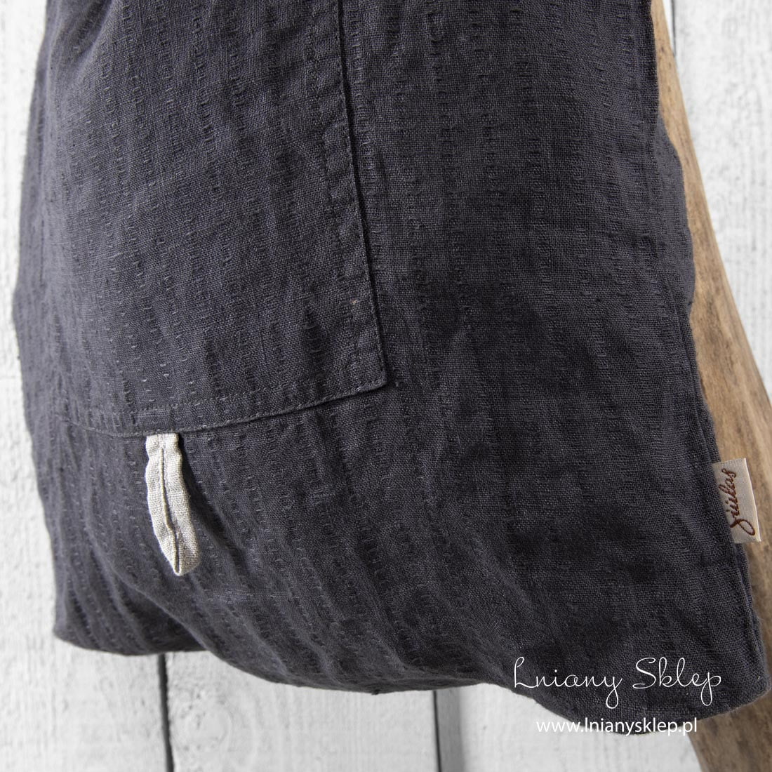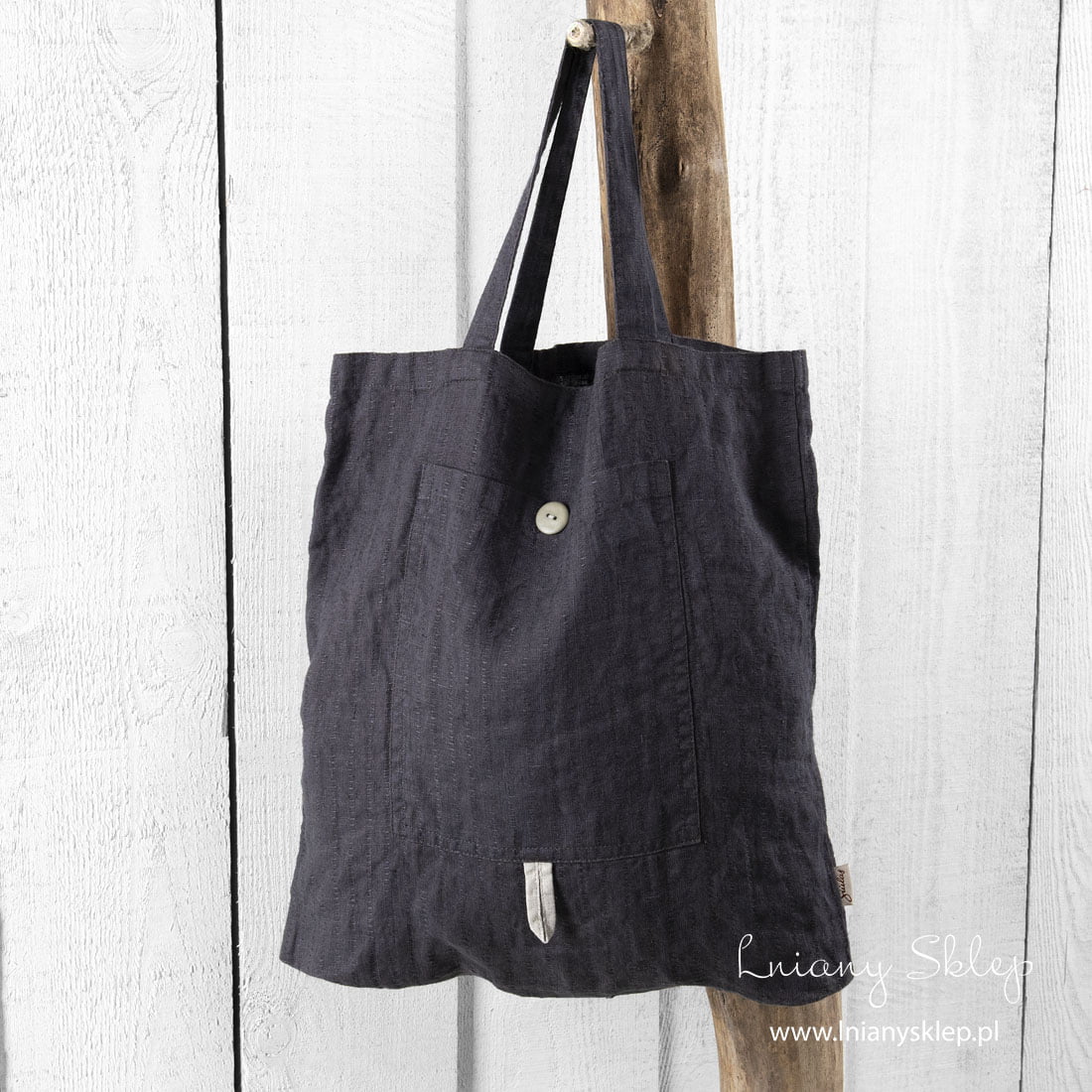 Lniana torba ciemny grafit z pranej tkaniny lnianej wytkanej w nieregularne prążki. Guzik i pętelka pozwalają zwinąć i wygodnie spiąć torbę w nieduży pakuneczek. Ramiączka długie 38cm. Torba z włókien naturalnych – idealna na spakowanie zakupów oraz różnych drobiazgów.