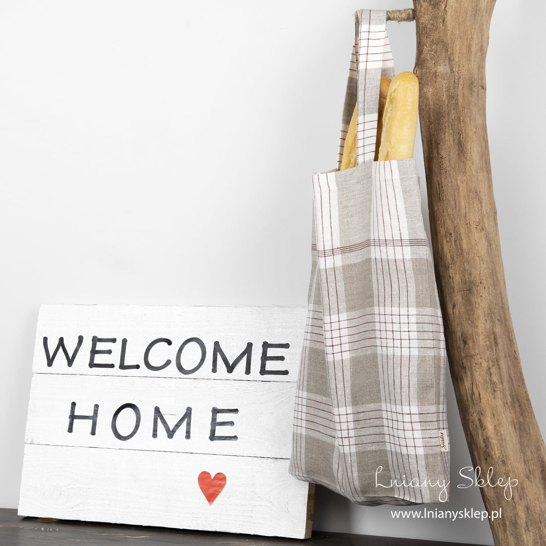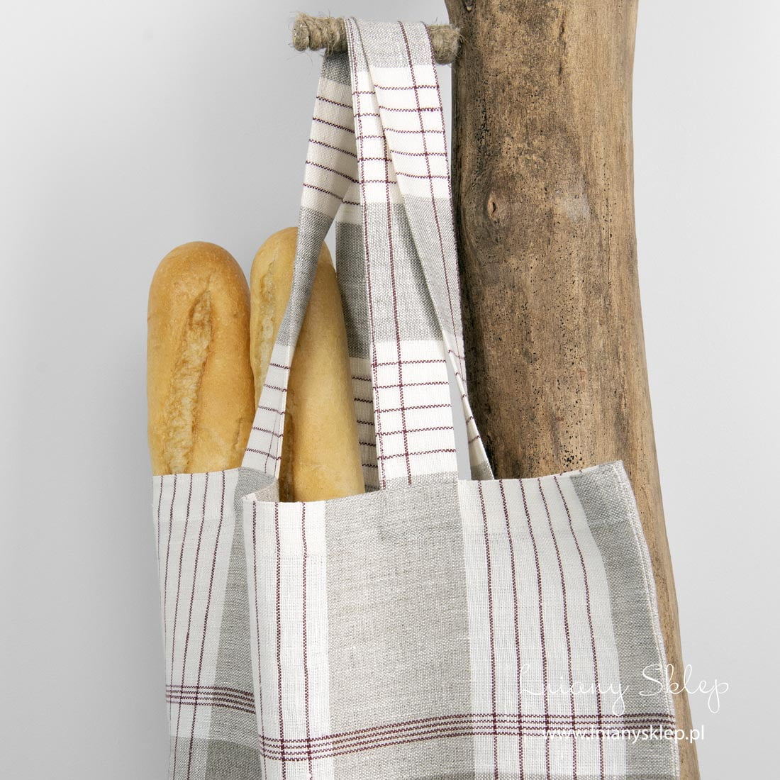 Lniana w kratkę torba z czerwonym paskiem. Z tkaniny wytkanej z przędzy niebarwionej, brązowej, mlecznobiałej i czerwonej. Ramiączka szerokie, długie 40cm. Torba z włókien naturalnych na spakowanie zakupów będzie wiernie i długo służyła. Pranie w temperaturze 40 C.