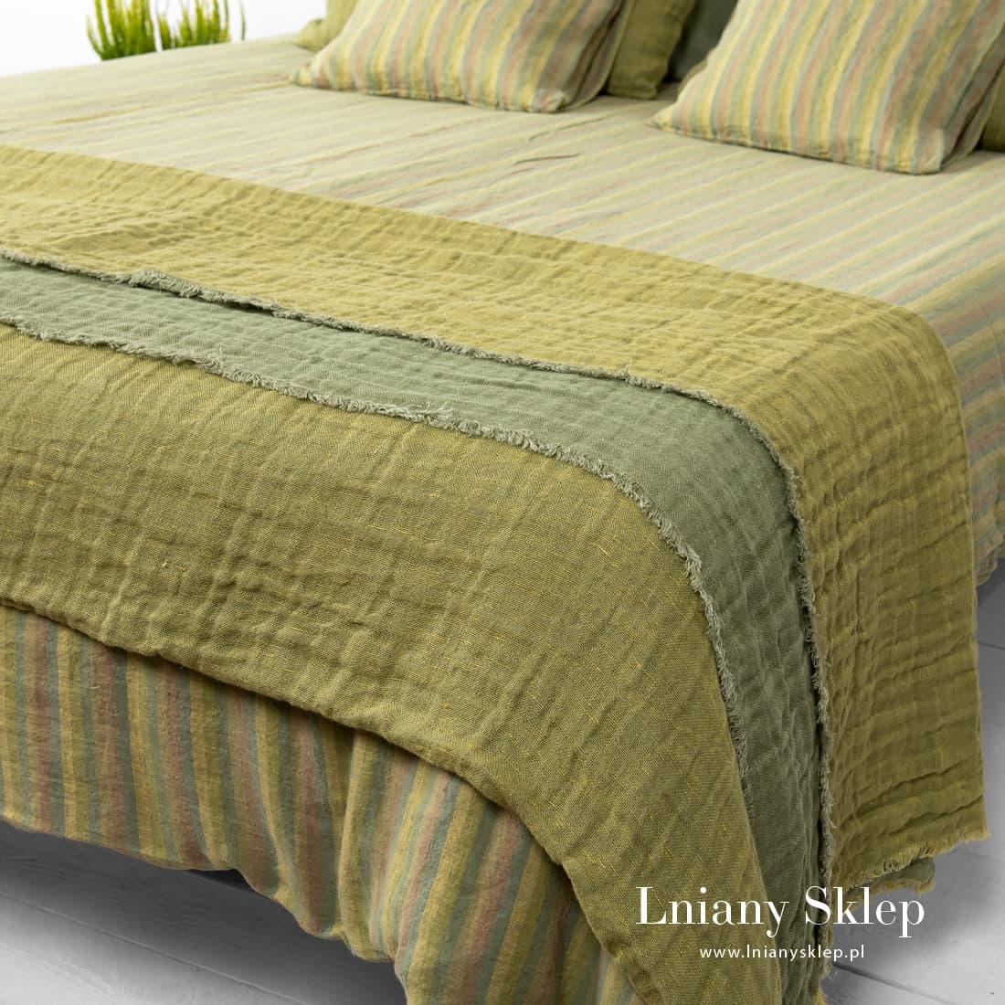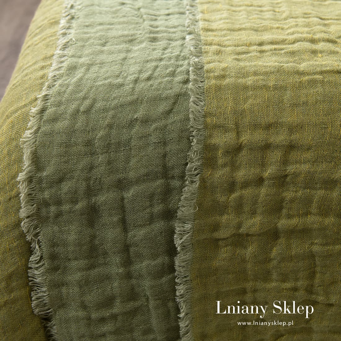 Zielona narzuta na łóżko jest dwustronna: jedna strona jasnozielona, druga, oliwkowa (bardziej żółta). Tkanina, z której uszyto poszewkę została poddana praniu (dekatyzacji). Narzuty pasują na łóżka mniejsze i większe, bo dostępne są w rozmiarach od 200cm x 220cm do 260cm x 260cm. Wszystkie brzegi narzuty zdobią 1,5cm strzępione frędzelki. W kolekcji mamy poszewki na poduszki dekoracyjne ALOE i komplety pościeli OLIV i BAMBOO, które są kolorystycznie będa bardzo pasowały do produktów z kolekcji ALOE. Ozdób sypialnię albo przytulny kącik wypoczynkowy na tarasie zielkonymi elementami tekstyliów domowych.