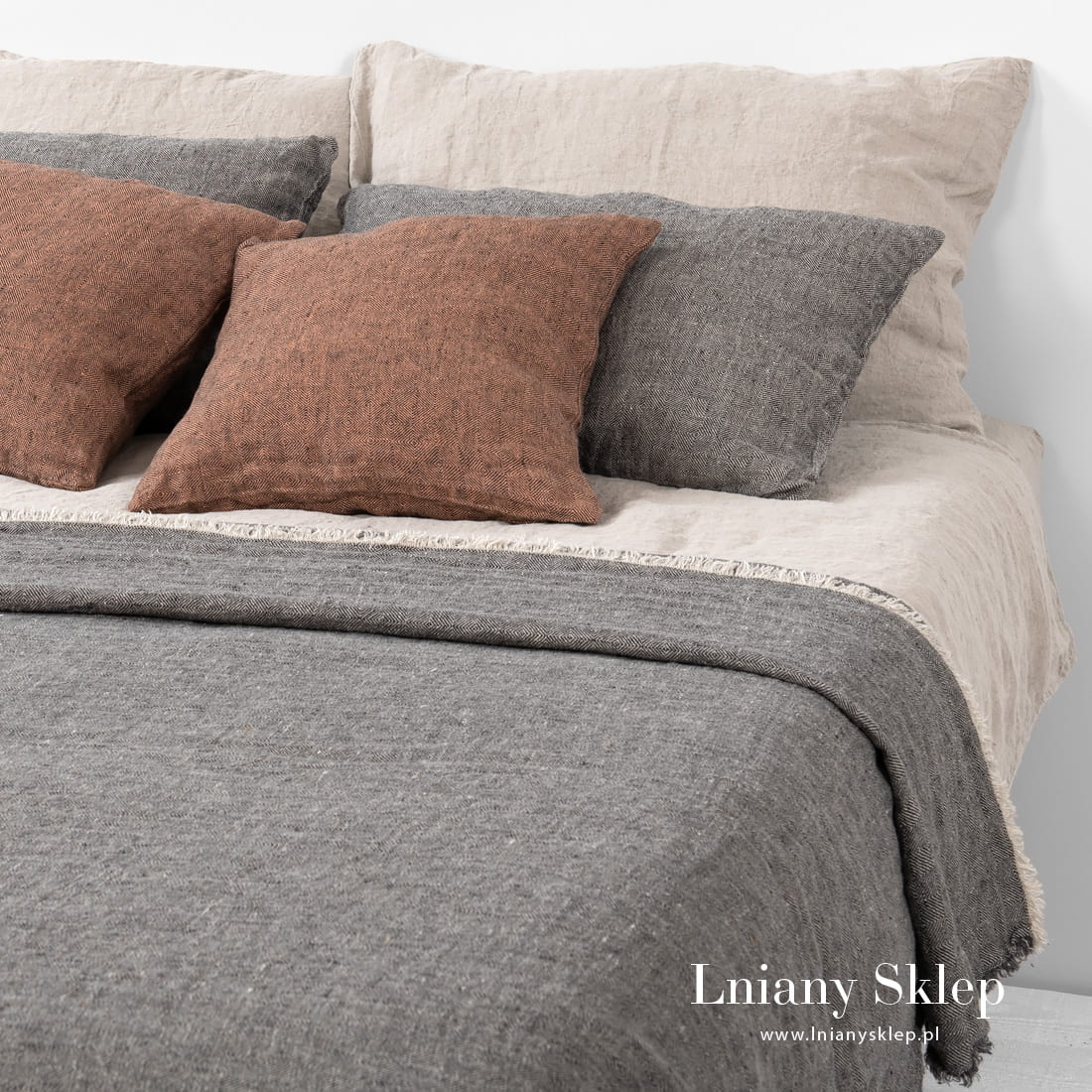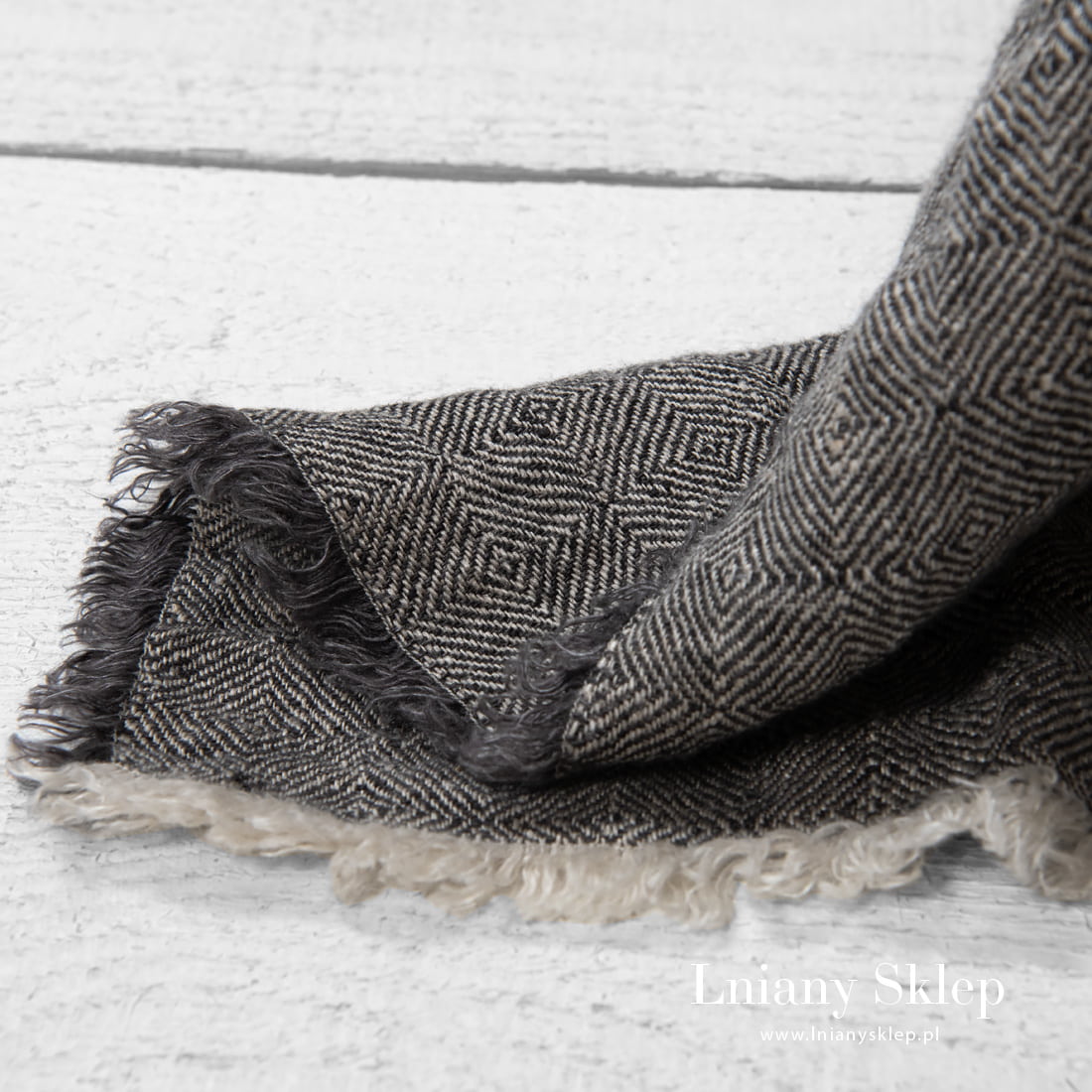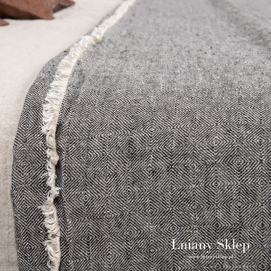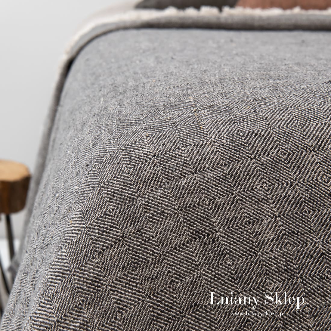 LEILA szara narzuta na łóżko wytkana w romby z przędzy ciemnoszarej i niebarwionej (szarej o piaskowym odcieniu). Subtelny wzór wytkany splotem skośnym z dopasowanych przędz spodoba się miłośnikom eleganckich produktów wystroju domu. Narzuta jest mięciutka, przytulna, bo uszyliśmy ją z poddanej praniu tkaniny. Brzegi narzuty ozdobione są zabawnymi frędzelkami. Dostępne rozmiary od 200cm x 220cm do 260cm x 260cm!