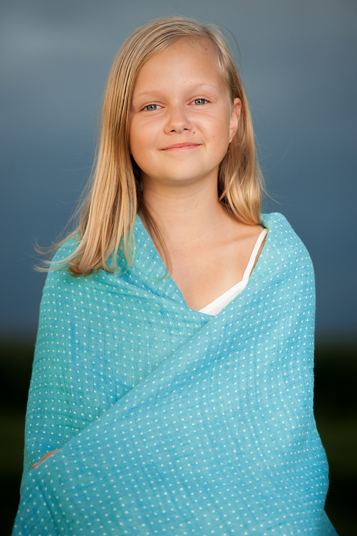 Turkusowy lniany pled pięknie wygląda z obydwu stron: jedna strona jest turkusowy w białe kropeczki, druga - mlecznobiała (lekko żółtawa) w niebieskie kropeczki. Cztery boki pledu są ozdobione frędzelkami długimi 1cm. Pled uszyto z pranej tkaniny lniano-bawełnianej, dlatego jest przyjemny w dotyku: miękki, przytulny, puszysty. Miękki pled - sympatyczny i praktyczny prezent dla dziecka.