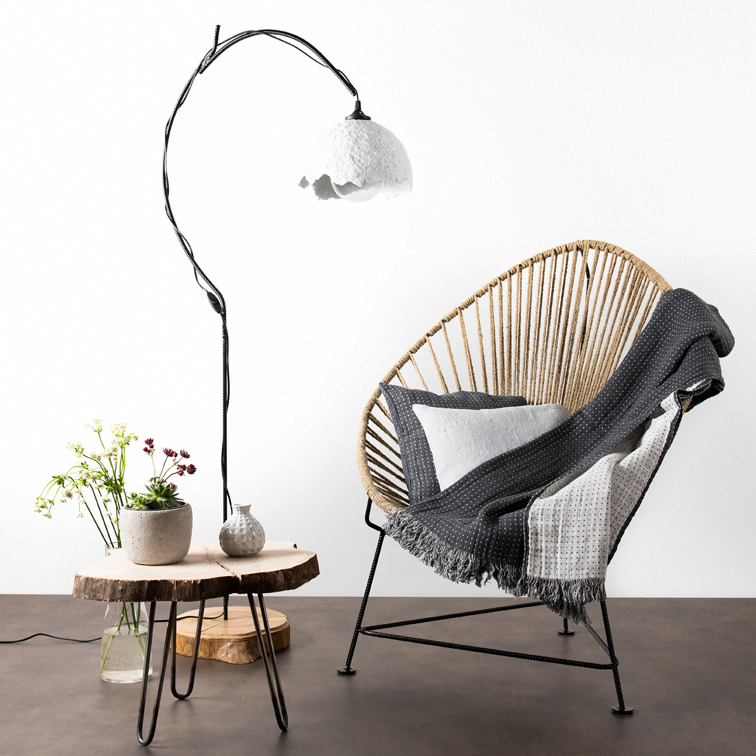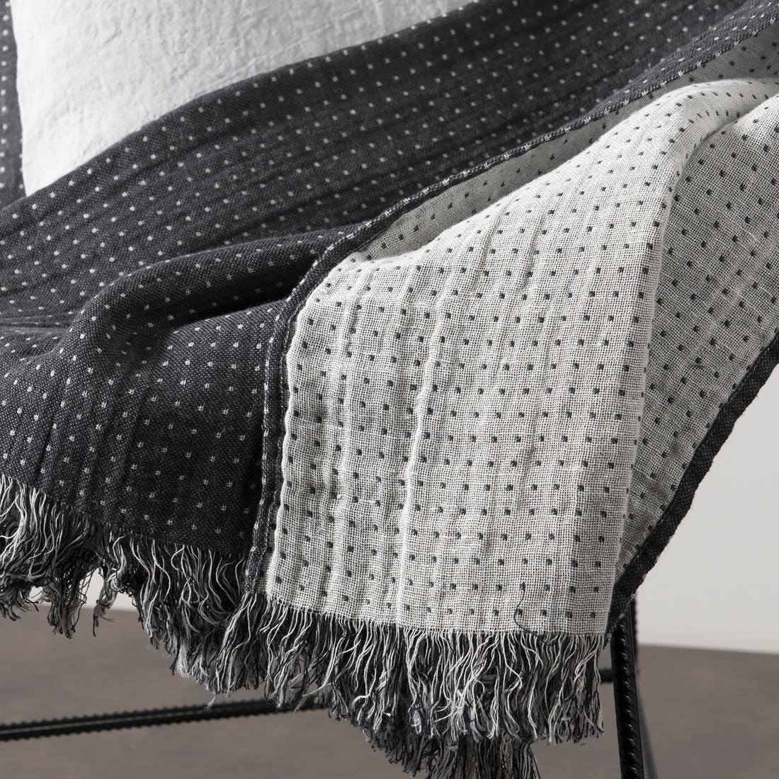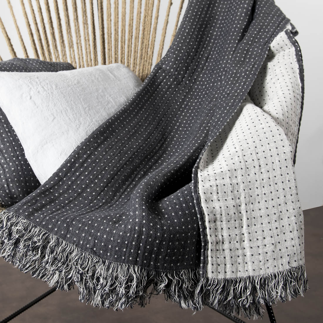 Dwustronny lniany pled w drobny groszek: grafitowy na białym tle i biały na grafitowym, ozdobiony frędzlami o długości 5cm. Pled z naturalnej, poddanej wcześniejszej dodatkowej obróbce - praniu tkaniny. Miękki i przytulny naturalny pled przyda się chłodniejszym wieczorem, będzie też sympatycznym akcentem przytulnego domu.