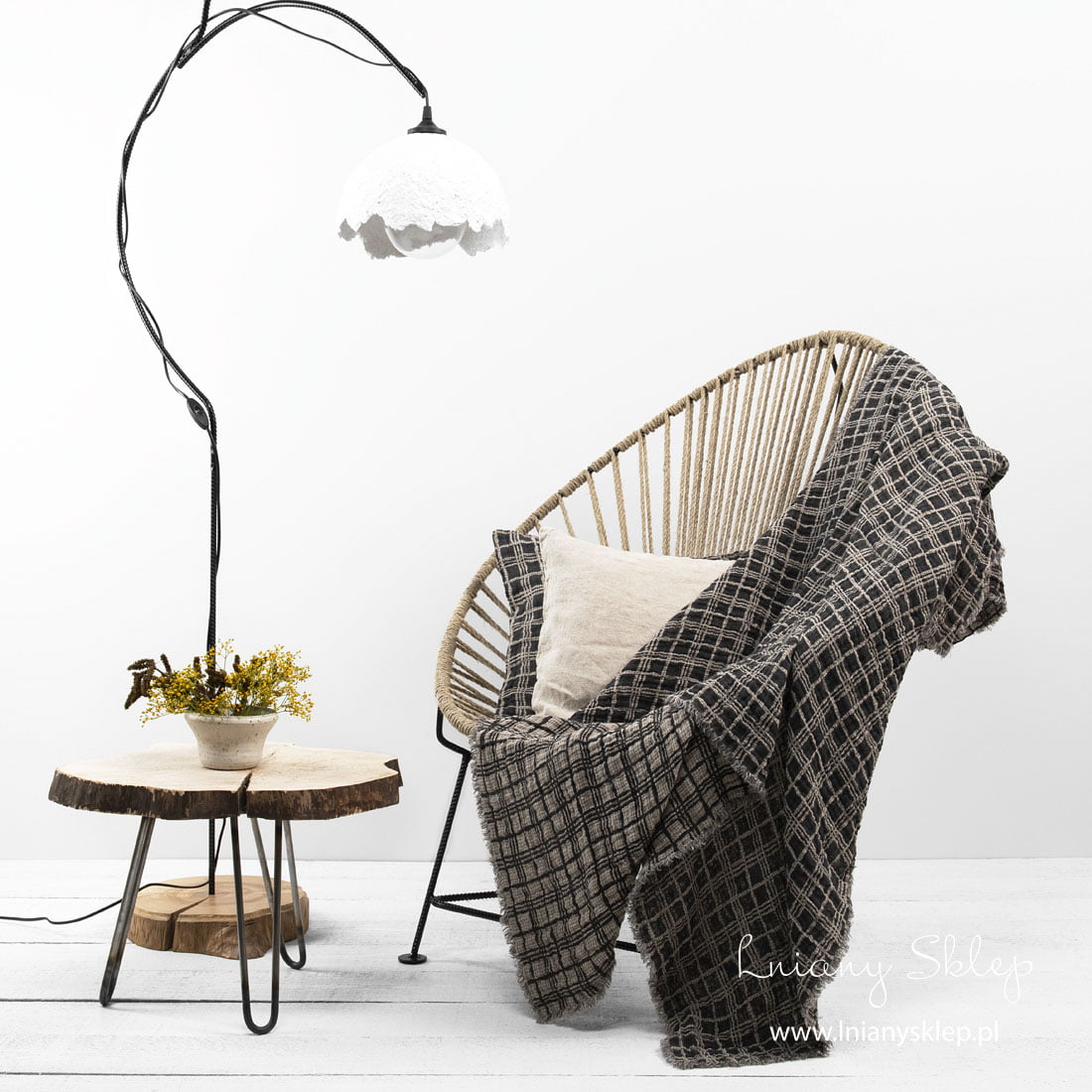 Lniany dwustronny pled w szarą kratkę. Pled uszyliśmy z tkaniny 100% lnianej wytkanej z przędzy czarnej piaskowej w geometryczny wzór. Jedna strona jaśniejsza kratka na ciemniejszym tle, na drugiej stronie – na odwrót. Brzegi pledu zdobią zabawne frędzelki 1,5cm. W procesie produkcji pled poddaliśmy praniu (dekatyzacji), dzięki czemu pled jest mięciutki i przytulny. Dopasuj poszewki na poduszki z identycznej tkaniny z naszej kolekcji. Narzuć pled na łóżko, owiń się nim, jeżeli jest chłodno!