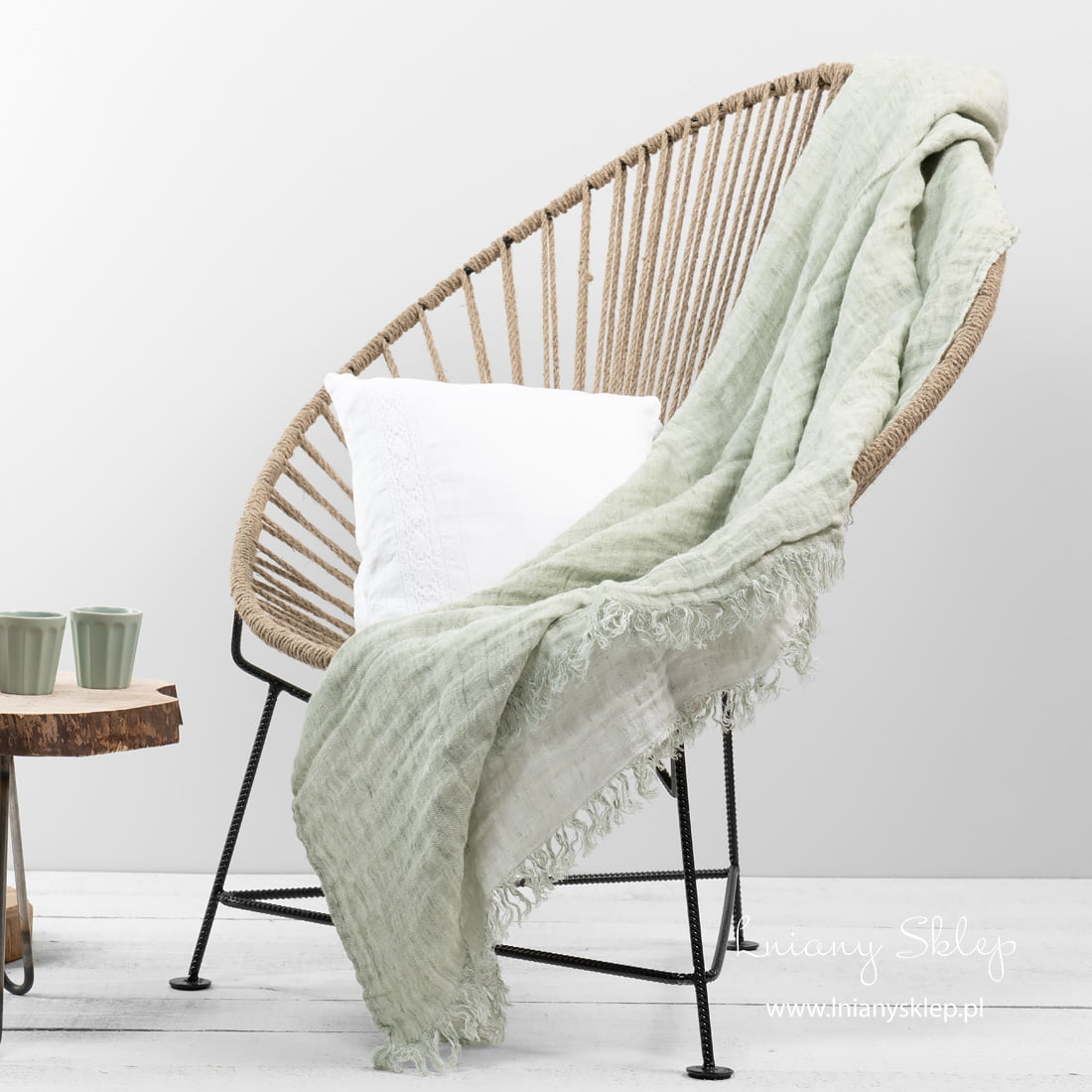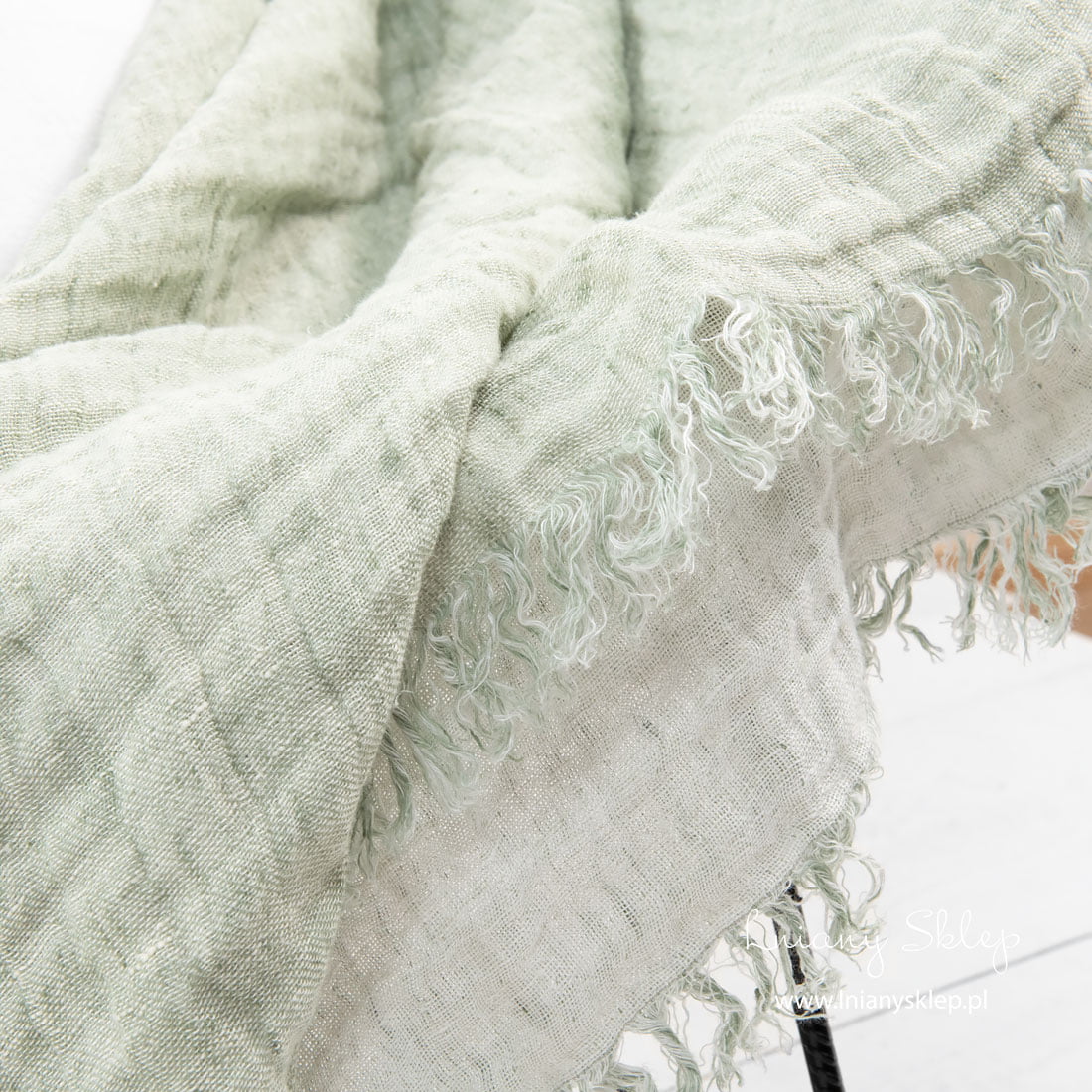 Dwustronny jasnozielony (kolor lekkiej mięty) z jednej i mlecznobiały z drugiej strony pled pięknie się prezentuje z obu stron. Krótsze strony pledu są ozdobione frędzelkami długimi 5cm. Lniany pled poddano praniu, dlatego jest wyjątkowo miękki i puszysty, nie ściągnie się też już po kolejnych praniach. Jeżeli szukasz przytulnego pledu dla siebie albo na prezent – zwróć uwagę na ten piękny, pastelowy, delikatny dwustronny pled!
