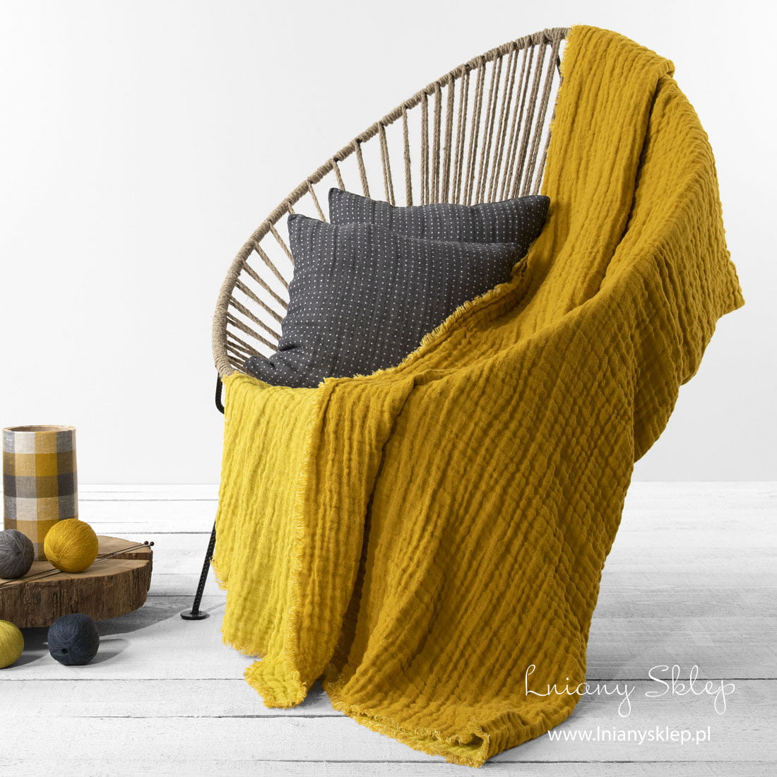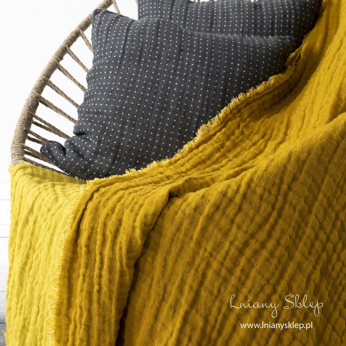 Lniany pled dwustronny żółty z jednej strony jest musztardowy (żółty wpadający w beż), z drugiej siarkowo żółty wpadający w zieleń. Po praniu pled jest bardzo miękki. Wszystkie cztery brzegi pledu zdobią frędzelki długie 1,5 cm. Jaskrawy pled niech uprzyjemni Ci wiele przytulnych wieczorów.