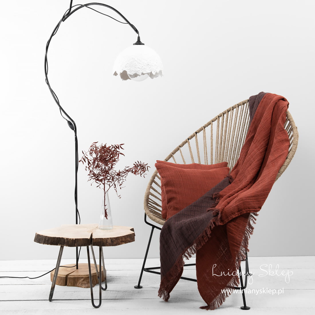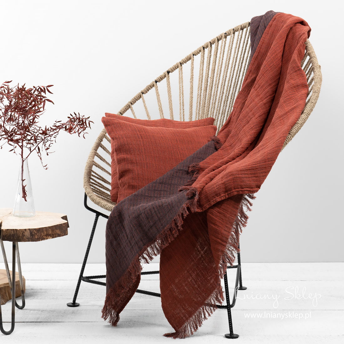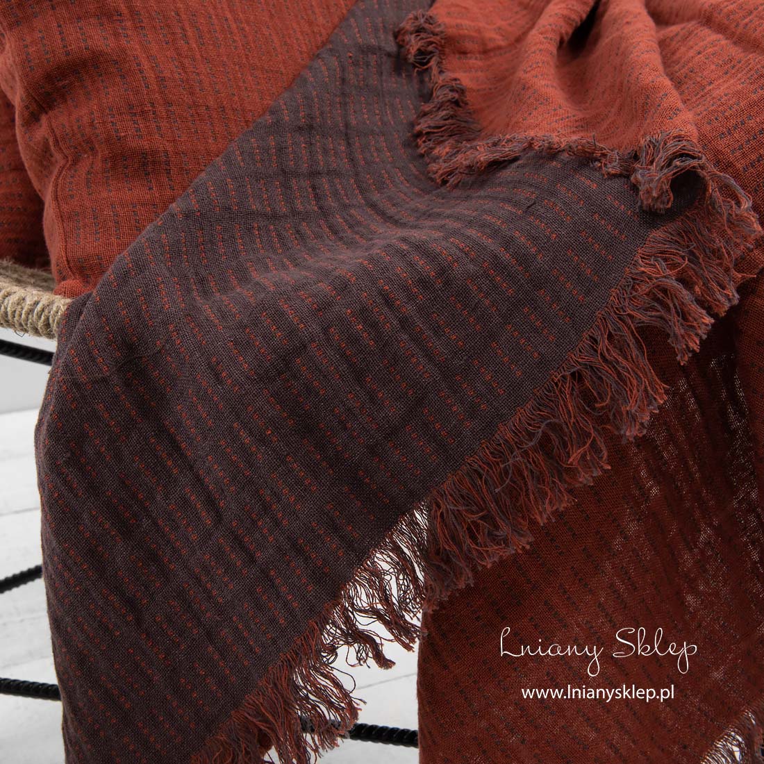 Odnowić otoczenie jest łatwo - czasem wystarczy dodać nowy, kolorowy akcent. Nasz piękny, o barwie czerwonej cegły w brązowe kropkowane kreseczki pled, może sprostać zadaniu. Obie strony żakardowego pledu pięknie się będą prezentował narzucone na łóżko. Krótsze strony pledu są ozdobione frędzelkami długimi 5cm. Lniano-bawełniany pled poddano praniu, dlatego jest miękki i nie ściągnie się po kolejnych praniach. Szukasz pomysłu na prezent – zwróć uwagę na ten piękny żakardowy dwustronny pled!