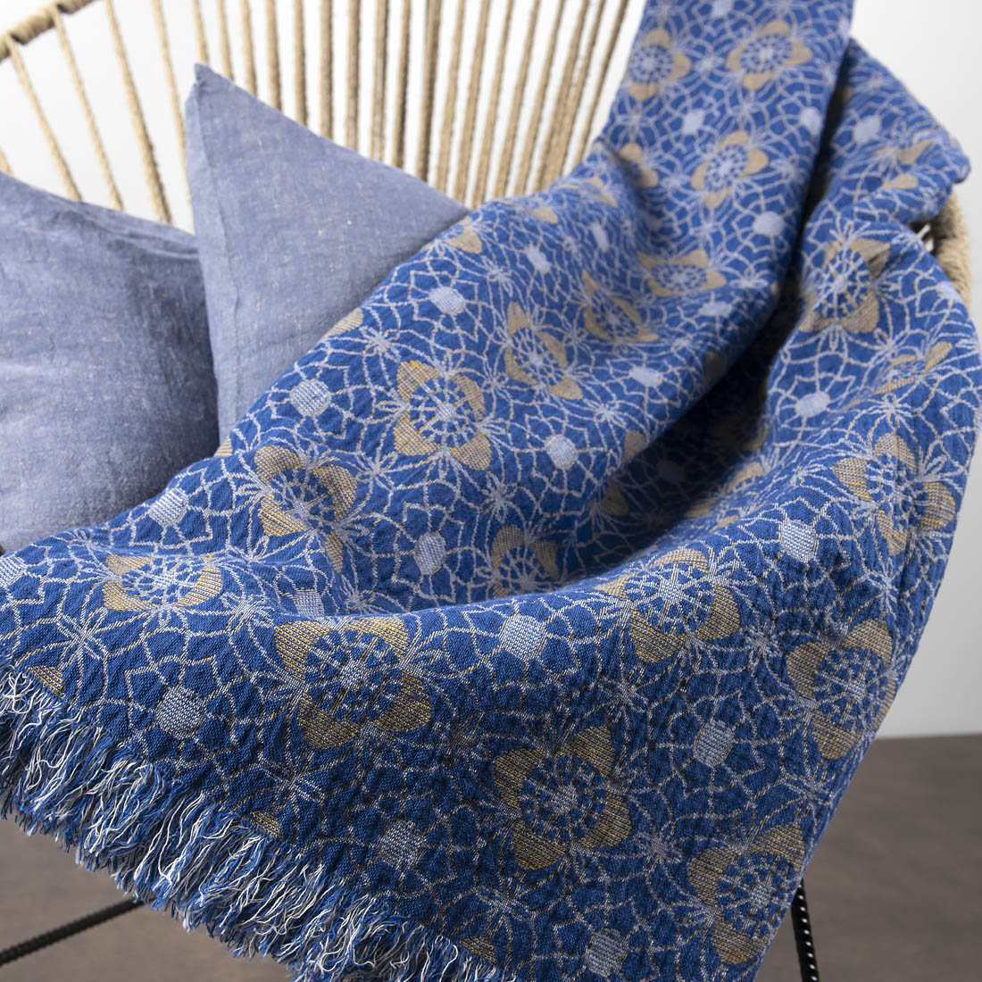 Piękny, wykwintny pled o barwie głębokiego błękitu, został wytkany z użyciem białej i musztardowej przędzy w stylizowany ornament kwiatowy. Obie strony żakardowego pledu pięknie się będą prezentowały jako narzuta na łóżko. Krótsze strony pledu są ozdobione frędzelkami długimi 5cm. Lniano-bawełniany pled poddano praniu, dlatego jest miękki i nie ściągnie się po kolejnych praniach. Miło jest zawinąć się w przytulny pled, jeżeli wieczór jest chłodny.