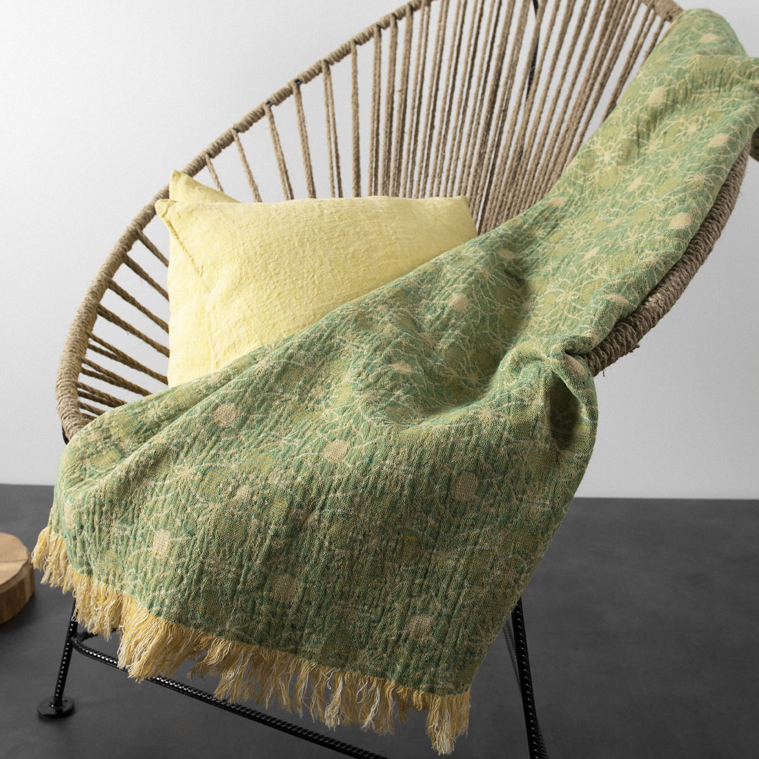 Pled wytkany z przędzy o barwie świeżej zieleni i żółtej w żakardowe, stylizowane kwiaty niewątpliwie odświeży nasze mieszkanie. Obie strony żakardowego pledu pięknie się będą prezentowały jako narzuta na łóżko. Krótsze strony pledu są ozdobione frędzelkami długimi 5cm. Lniano-bawełniany pled poddano specjalnemu praniu, dlatego jest miękki i nie ściągnie się po kolejnych praniach. Piękny pled stanie się pięknym akcentem w mieszkaniu, chłodnym wieczorem miło będzie się w niego owinąć.