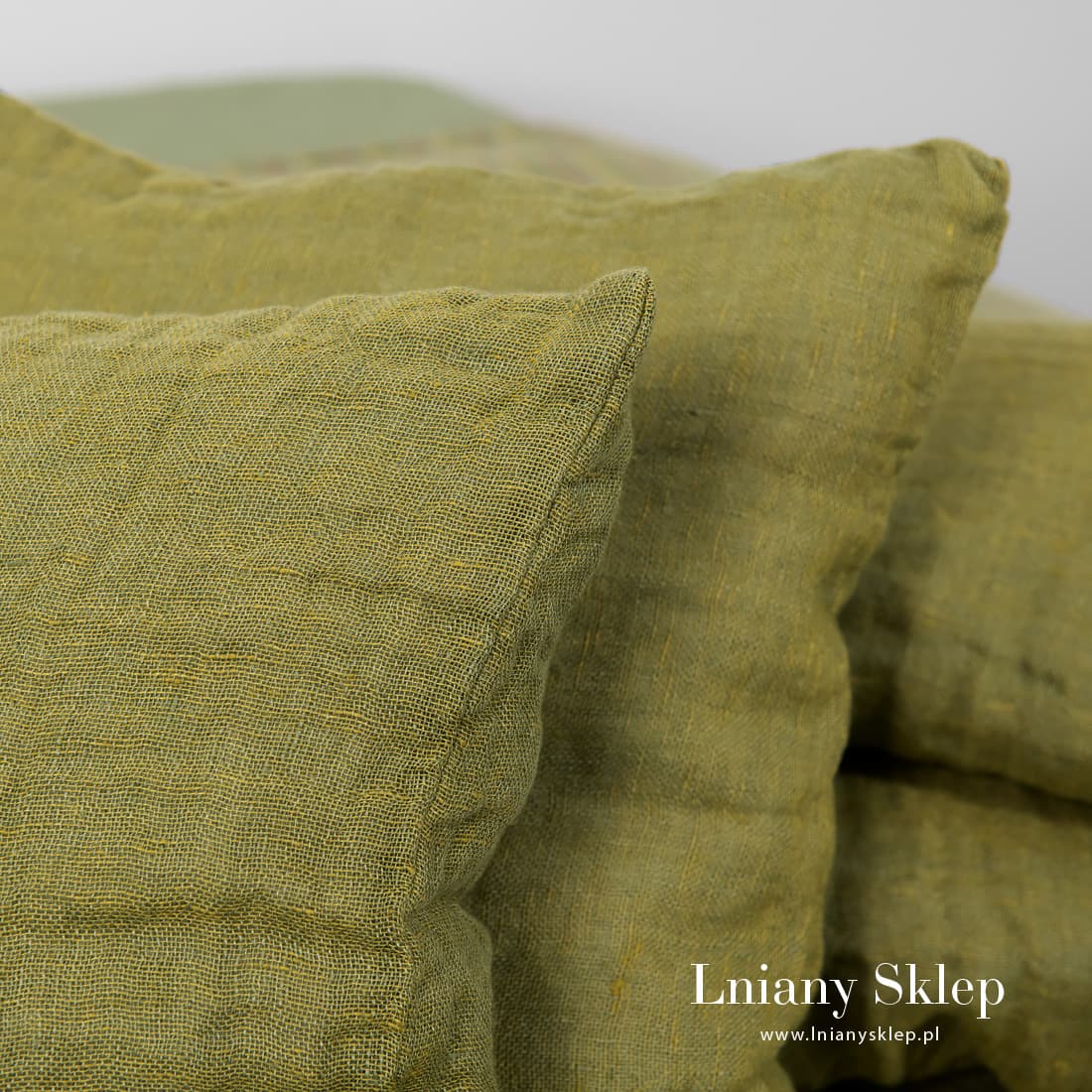 Zielona poszewka na poduszkę dekoracyjną z pranej tkaniny 100% lnianej. Tkanina, z której uszyto poszewkę została wytkana z przędzy zielonej i zielonej o żółtym odcieniu (oliwkowej). Poszewka ma ukryty zamek błyskawiczny. W kolekcji mamy dwustronną narzutę na łóżko ALOE. Ozdób sypialnię albo przytulny kącik wypoczynkowy na tarasie zielkonymi elementami tekstyliów domowych.