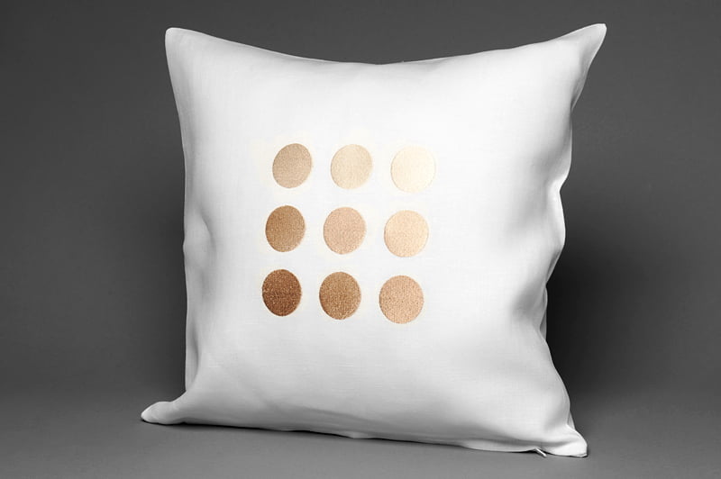 Dekoracyjna mlecznobiała (żółtawa) powłoczka na poduszkę ozdobiona w centrum geometrycznym wzorem połyskujących grochów. Powłoczka zapinana na zamek błyskawiczny.