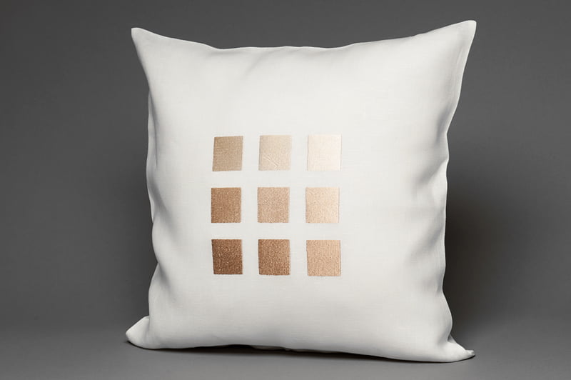 Dekoracyjna, świąteczna powłoczka z mlecznobiałego (żółtawego) lnu, ozdobiona w centrum geometrycznym wzorem połyskujących kwadratów. Powłoczka zapinana na zamek błyskawiczny.