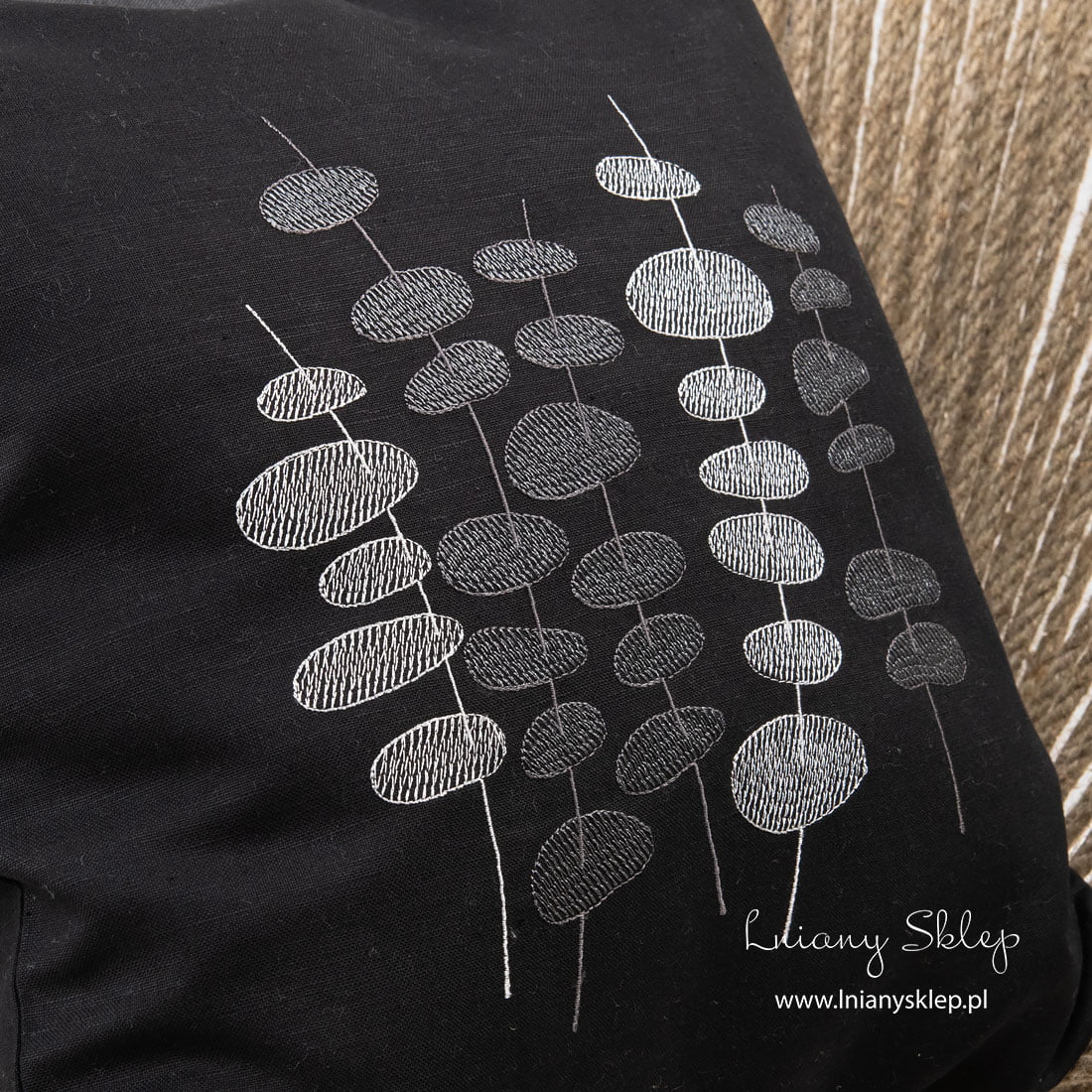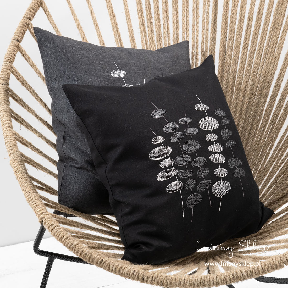 Czarna poszewka dekoracyjna haftowana nicią białą i szarą w stylizowane motywy roślinne. Wygodnie się zasuwa na zamek błyskawiczny. W naszej kolekcji też szara ozdobiona identycznym haftem poszewka. Poszewki pięknie ozdobią kanapę lub łóżko.