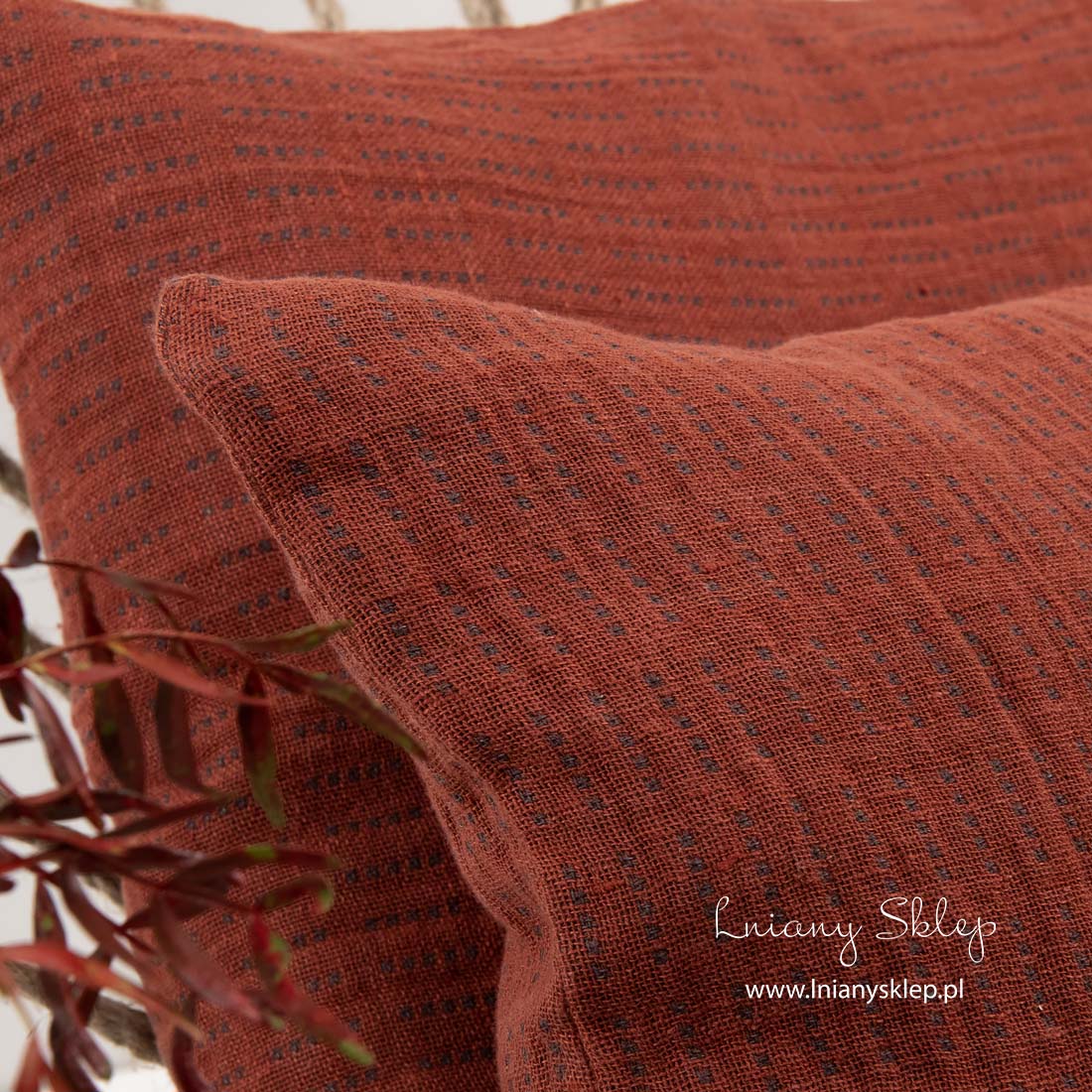 Czerwona poszewka na poduszkę w brązowe nieregularne prążki. Zasuwa się na zamek błyskawiczny. Poszewka w kolorze czerwonej cegły z pranej, mięciutkiej tkaniny ładnie będzie się prezentować na kanapie albo fotelu. W naszej kolekcji pled wykonany w dopasowanej barwie.