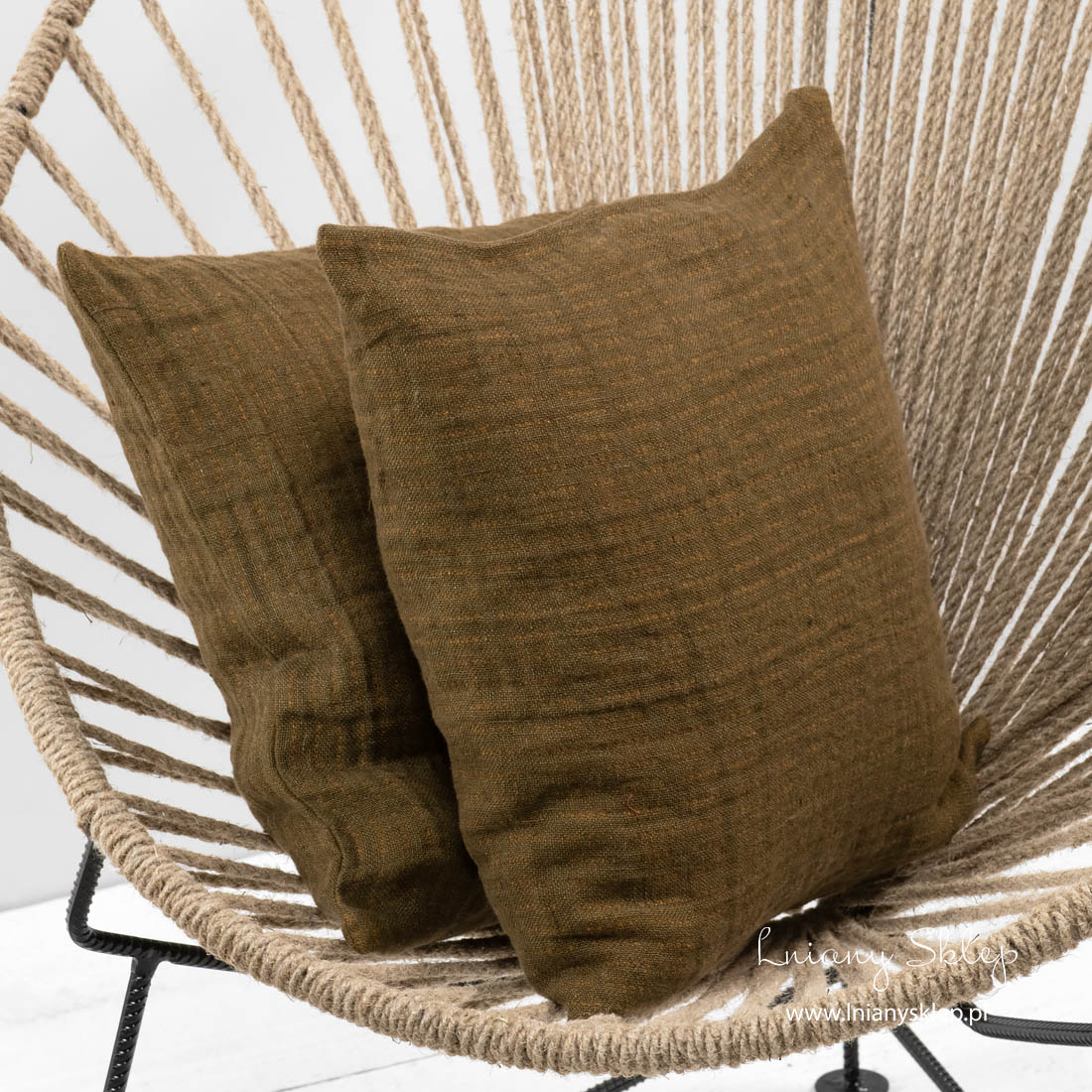 Khaki poszewka na poduszkę w brązowe o złotawym odcieniu nieregularne prążki. Wygodnie się zasuwa się na zamek błyskawiczny. Poszewka z pranej, mięciutkiej dwustronnej tkaniny ma w naszej kolekcji parę – pled z identycznej dwustronnej tkaniny. Przytulną atmosferę w domu tworzą przytulne dodatki.