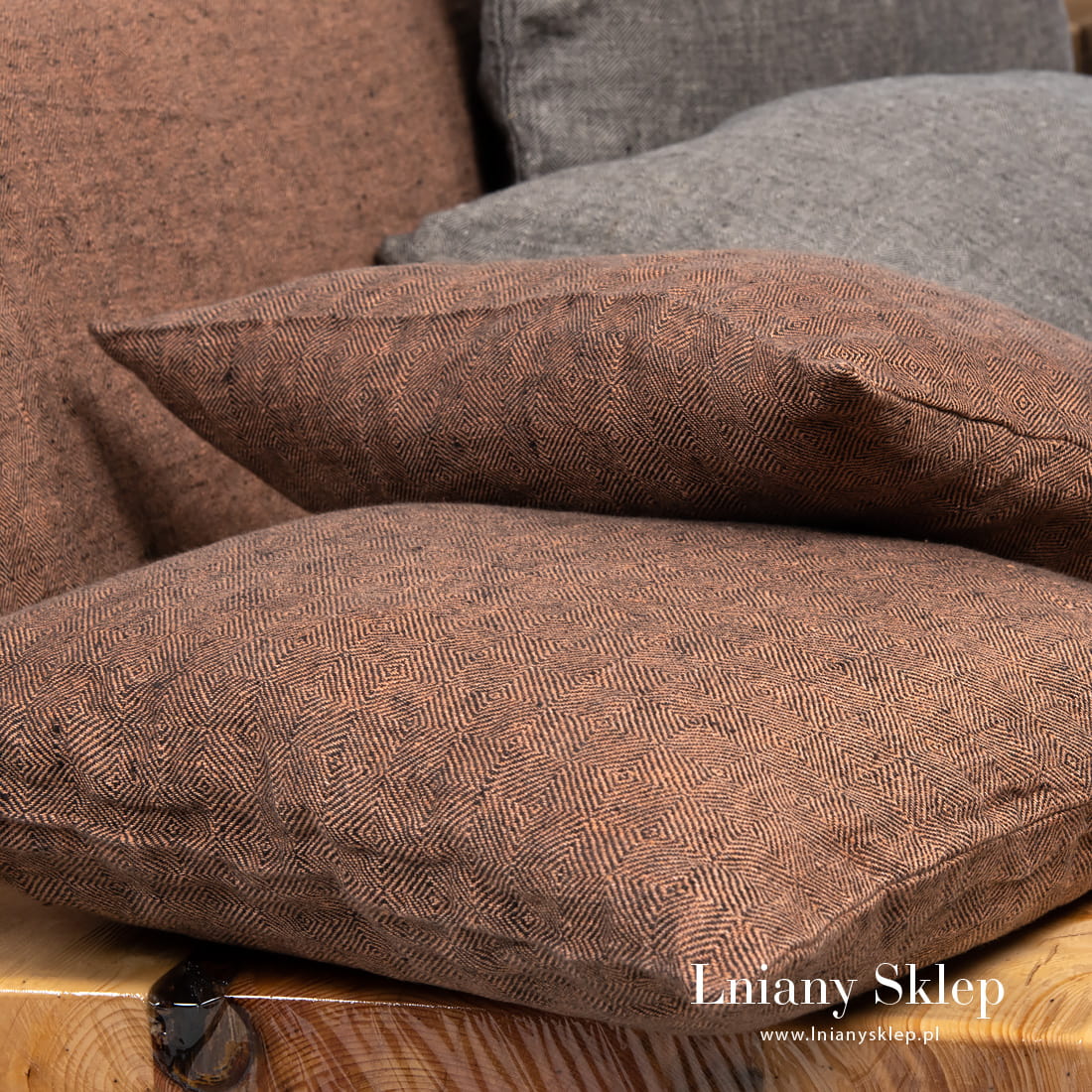 LEILA brązowa poszewka na poduszkę z tkaniny pranej, mięciutkiej, wytkanej z przędzy ciemnoszarej i jasnobrązowej. Subtelny wzór rombów wytkany splotem skośnym z dopasowanych przędz pięknie zagra na poduszce zasuwanej na zamek błyskawiczny. W naszej kolekcji mamy narzuty na łóżko z identycznej tkaniny. Zmień wystrój swej sypialni, wybierz len 100%.
