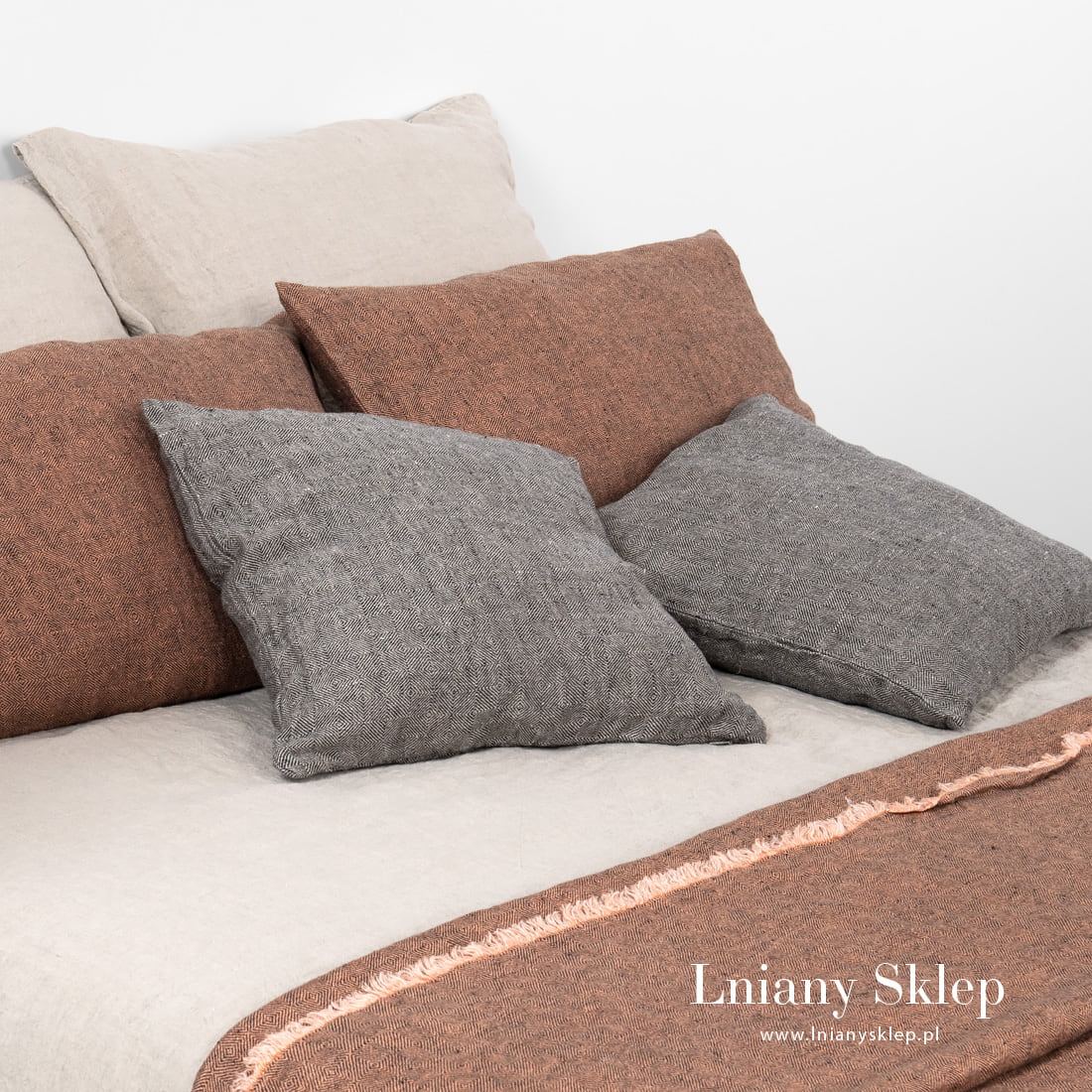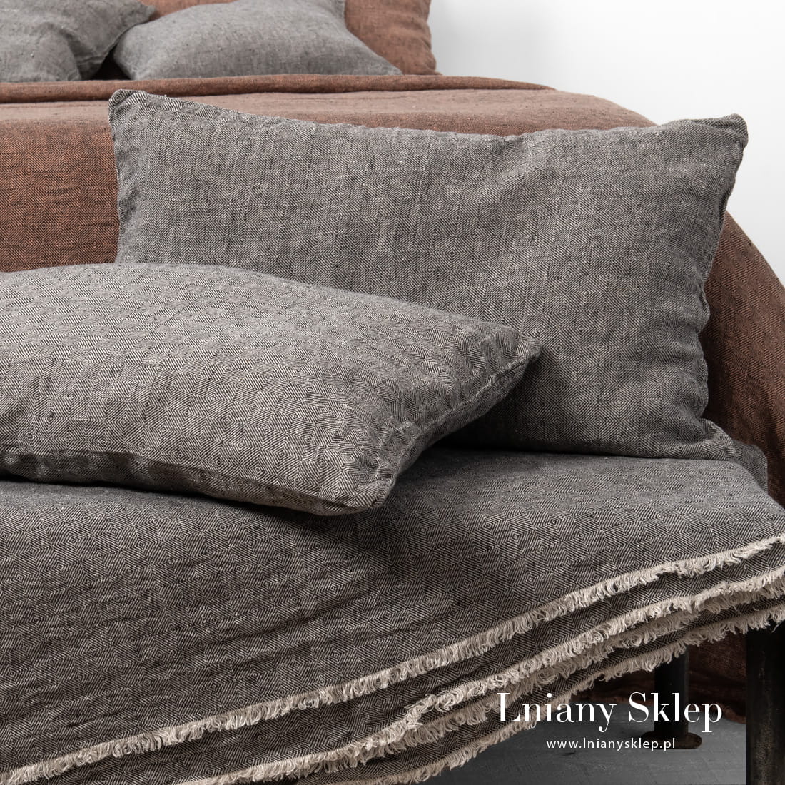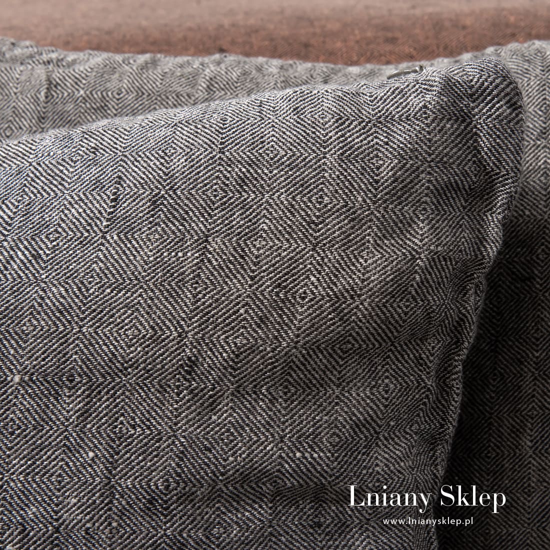 LEILA szara poszewka na poduszkę wytkana z przędzy 100% ciemnoszarej i niebarwionej (szarej o piaskowym odcieniu). Subtelny wzór rombów wytkany splotem skośnym z dopasowanych przędz pięknie zagra na poduszce. Poszewka uszyta z poddanej praniu tkaniny - jest mięciutka i przytulna. Zasuwana na zamek błyskawiczny. W naszej kolekcji – narzuty na łóżko z identycznej tkaniny.