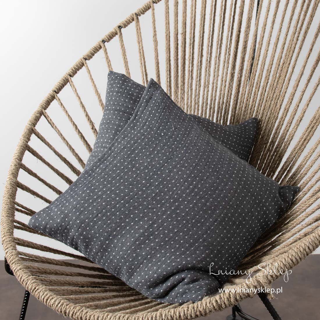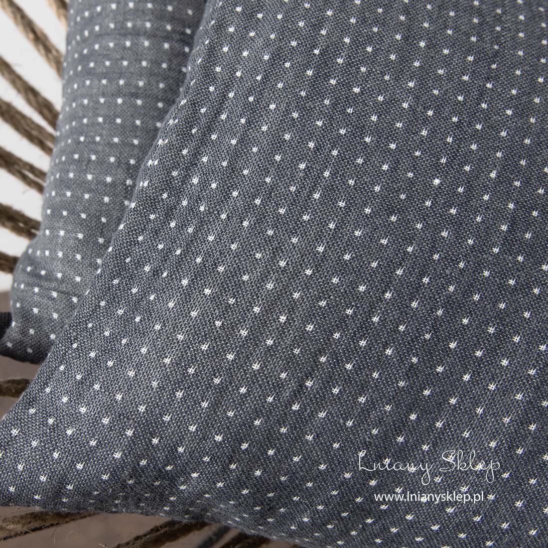 Lniana poszewka dekoracyjna szara w kropeczki wytkana z przędzy czarnej i ciemnoszarej. Kropeczki – mlecznobiałe. Tkaninę lniano – bawełnianą poddaliśmy zmiękczeniu przez pranie. Zasuwana na zamek błyskawiczny. W naszej kolekcji mamy pled wytkany w identyczny wzór.