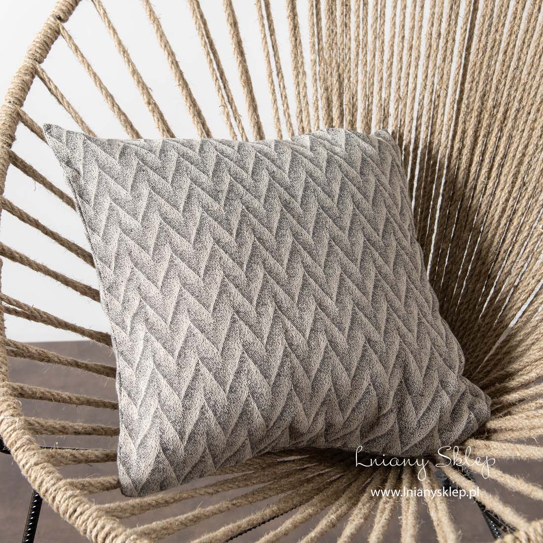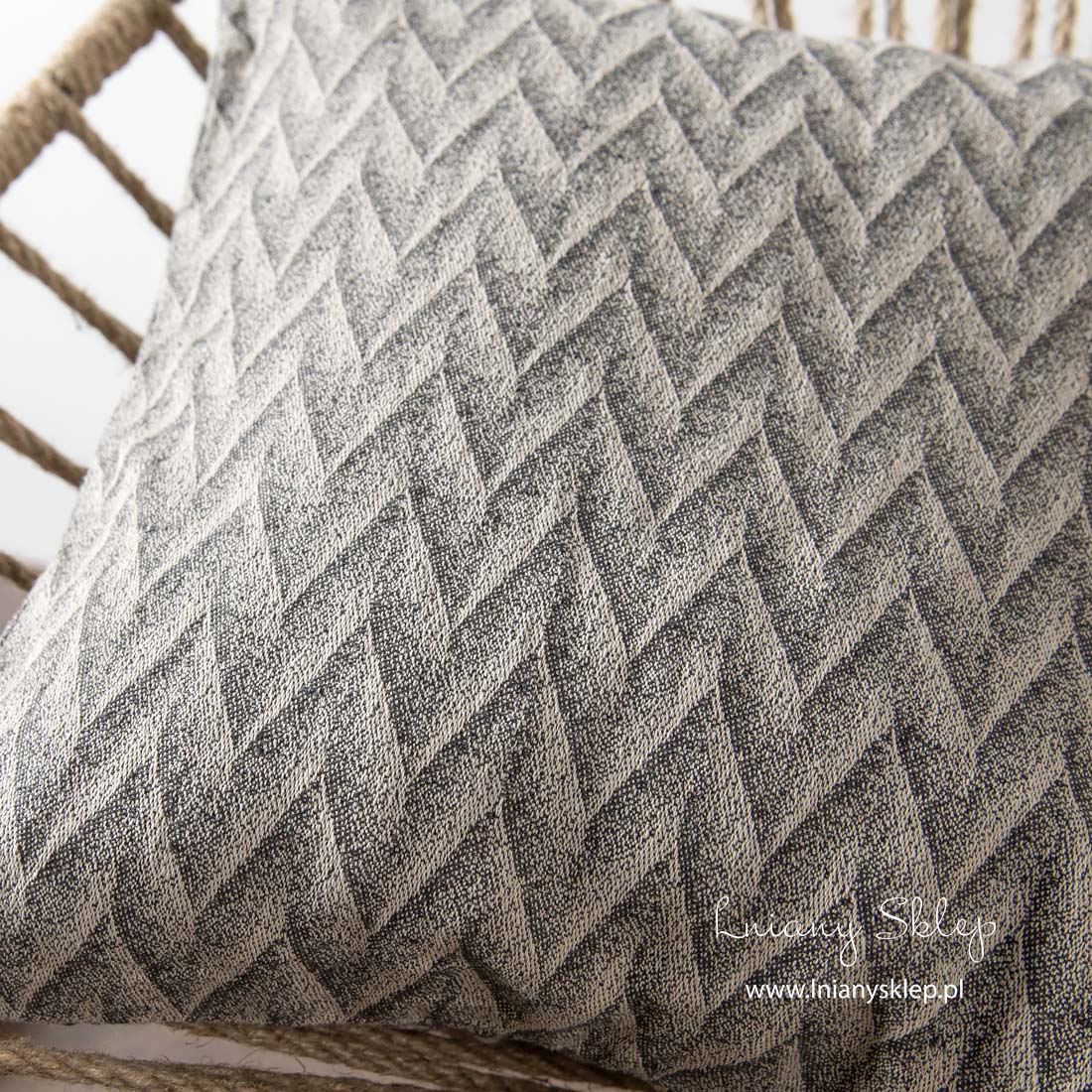 Lniana poszewka dekoracyjna w szare zygzaki wytkana z przędzy jasnej i ciemnej szarej. Tkaninę lniano – bawełnianą poddaliśmy zmiękczeniu przez pranie. Zasuwana na zamek błyskawiczny. Poduszka ozdobiona żakardowym wzorem 3D ładnie będzie współgrała z pledem wytkanym w identyczny wzór z naszej kolekcji.