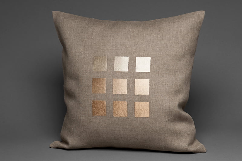 Dekoracyjna, świąteczna powłoczka na poduszkę w kolorze naturalnego lnu, ozdobiona w centrum geometrycznym wzorem połyskujących kwadratów. Powłoczka zapinana na zamek błyskawiczny.