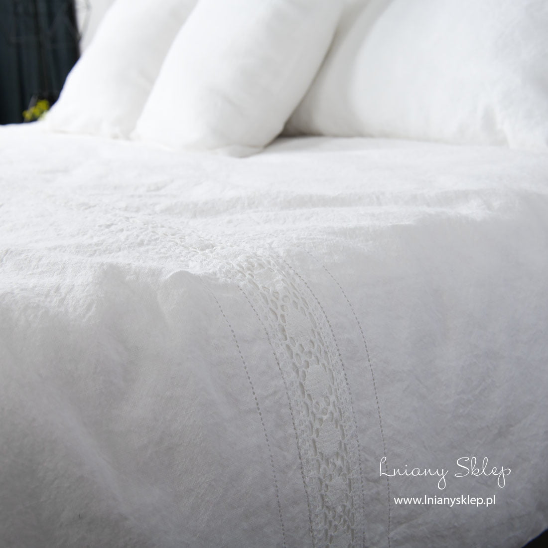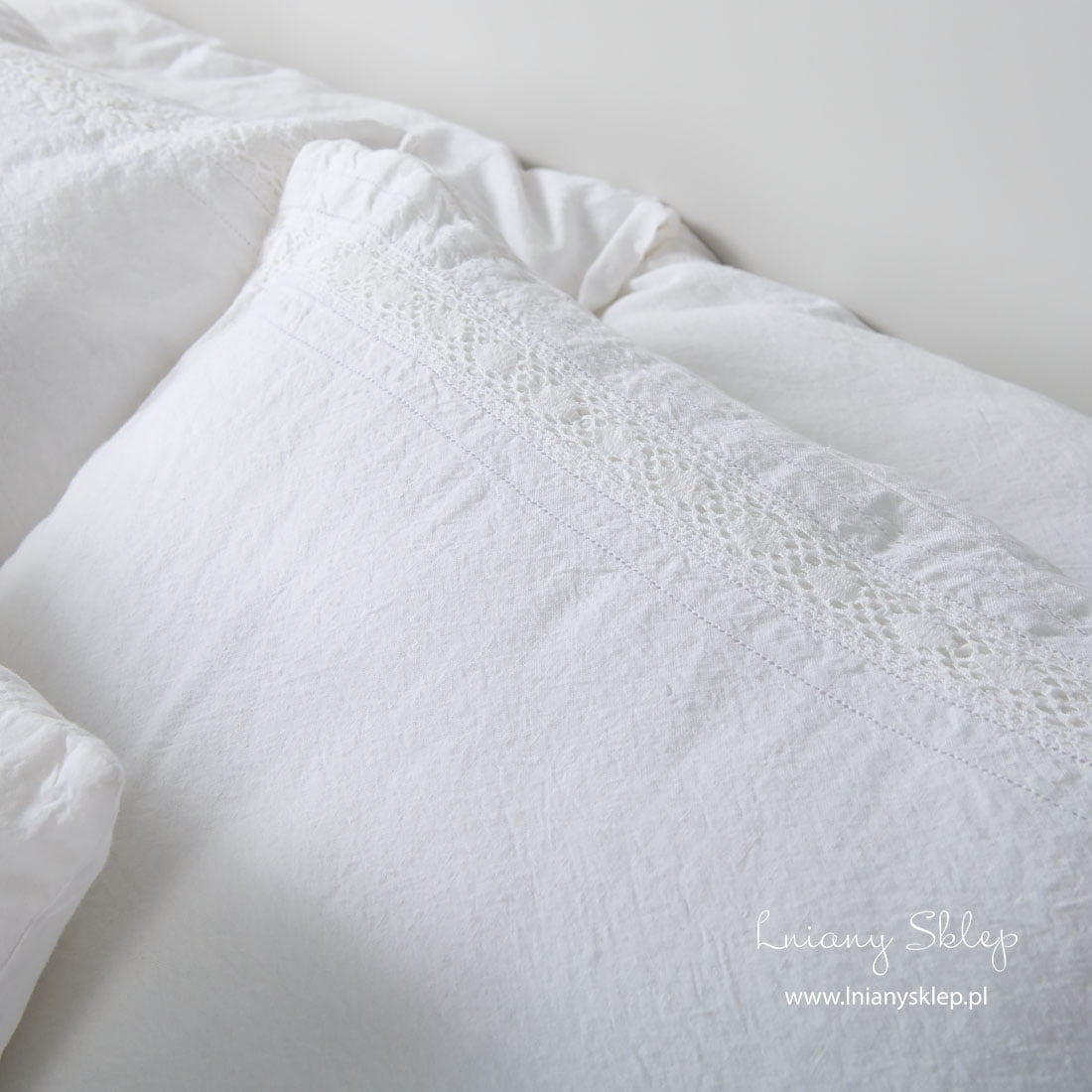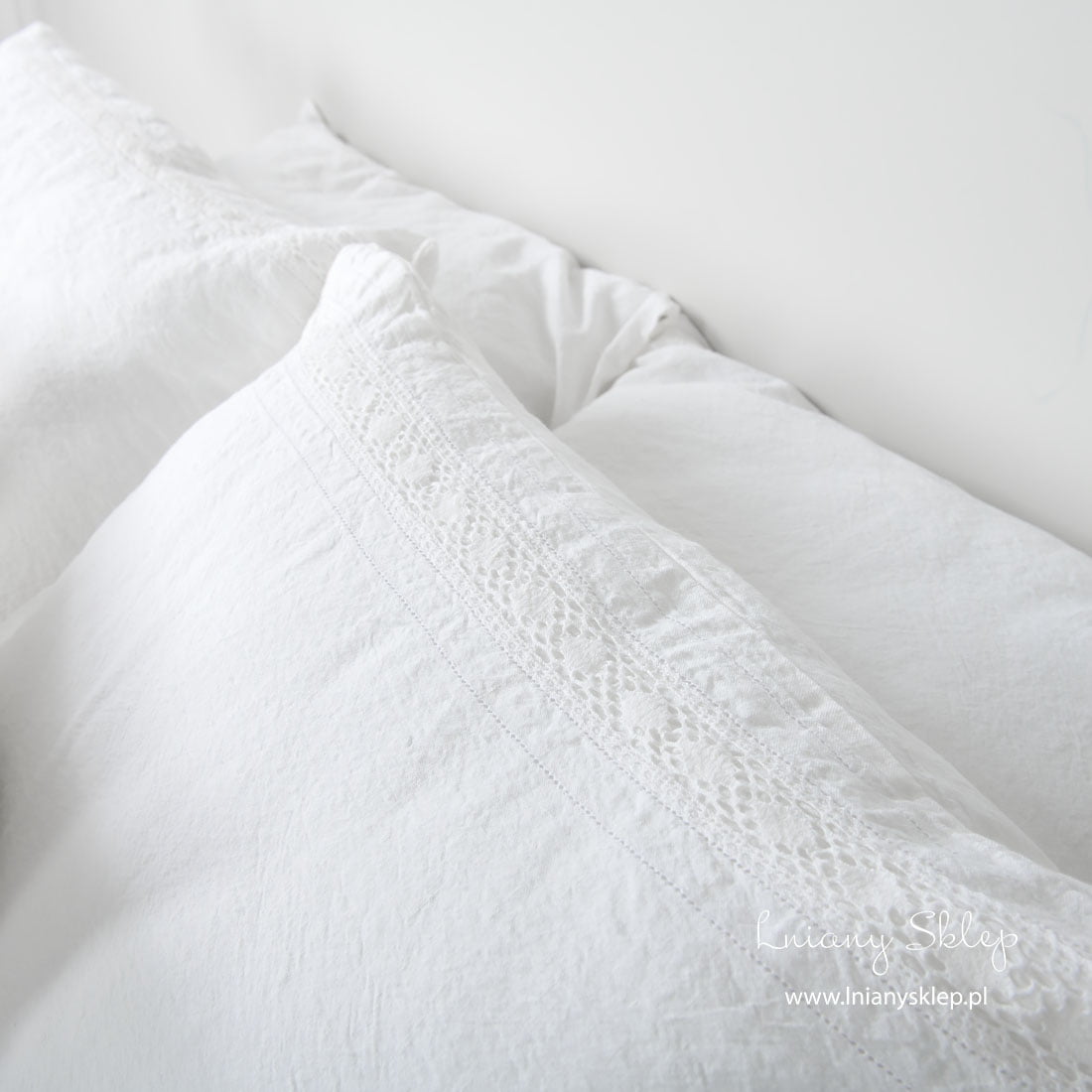 Biała pościel ozdobiona koronkami (poszwy i poszewki) została uszyta ze śnieżnobiałej tkaniny lniano – bawełnianej. Pościel została ozdobiona delikatną koronką lnianą i mereżką po obu jej stronach. Tkanina po poddaniu praniu uzyskała lekko gniecioną fakturę - nie potrzebuje prasowania. Ten przytulny, elegancko zdobiony komplet śnieżnobiałej pościeli zasługuje na Twoją uwagę!