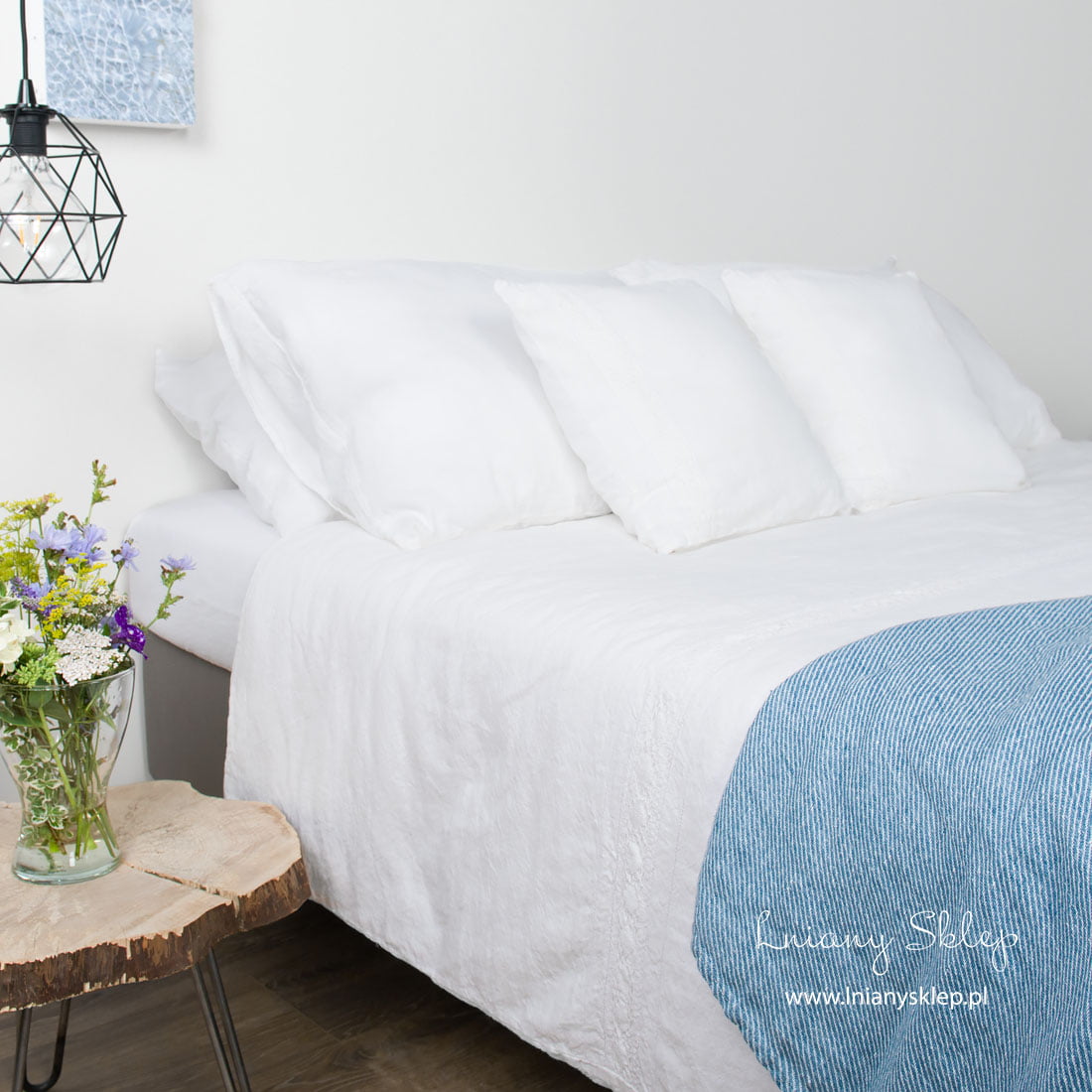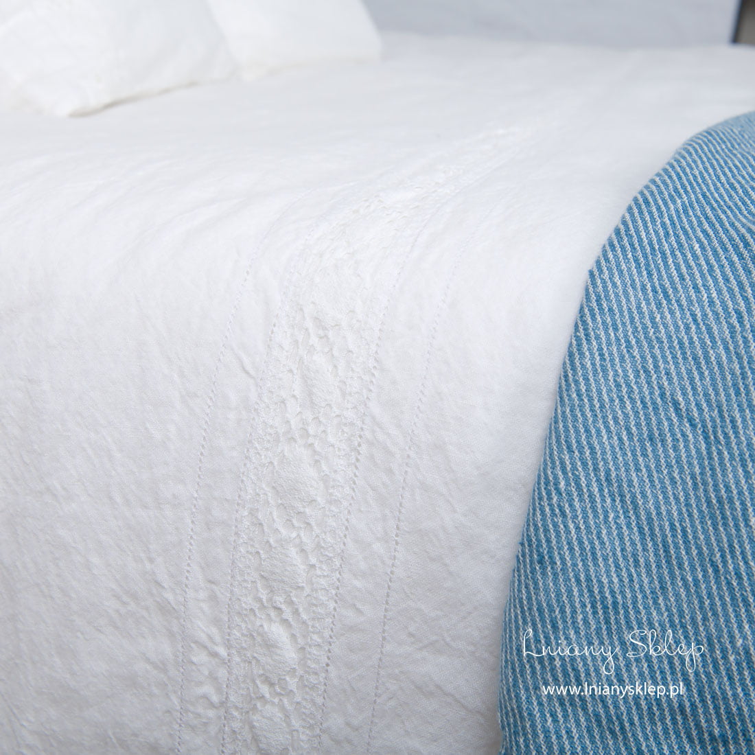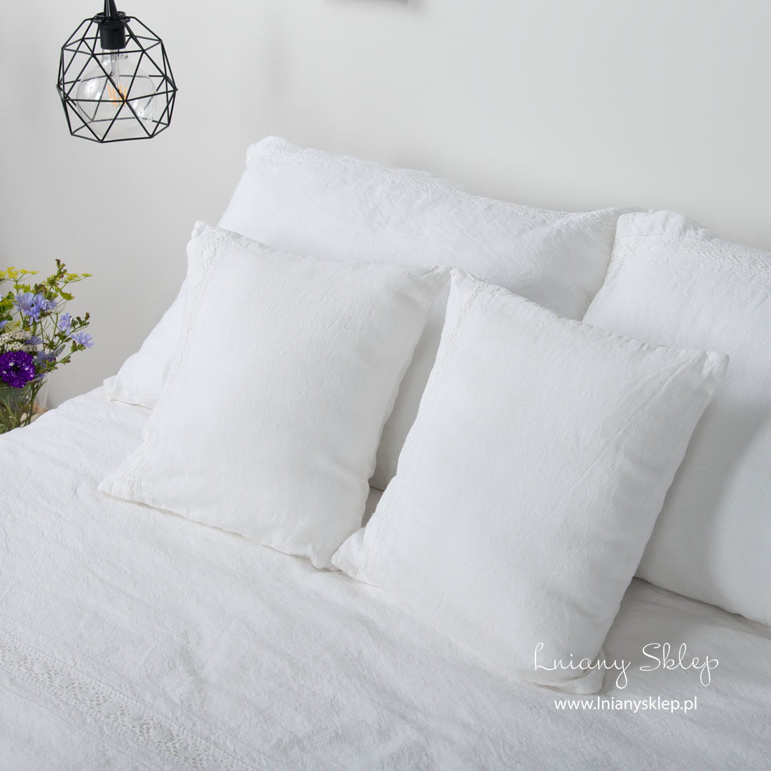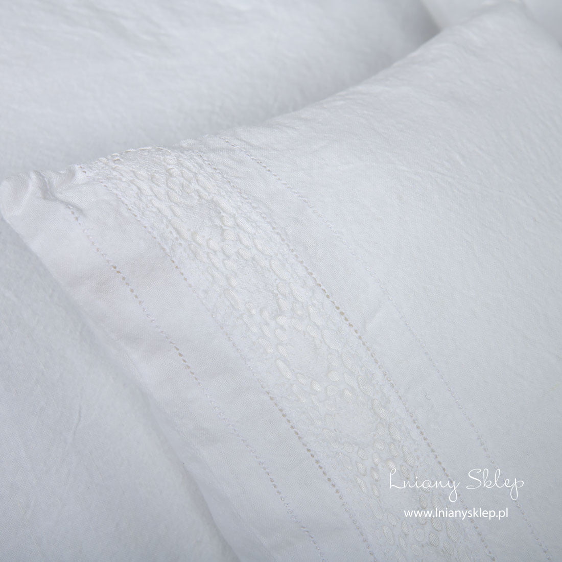 Biała pościel ozdobiona koronkami (poszwy i poszewki) została uszyta ze śnieżnobiałej tkaniny lniano – bawełnianej. Pościel została ozdobiona delikatną koronką lnianą i mereżką po obu jej stronach. Tkanina po poddaniu praniu uzyskała lekko gniecioną fakturę - nie potrzebuje prasowania. Ten przytulny, elegancko zdobiony komplet śnieżnobiałej pościeli zasługuje na Twoją uwagę!