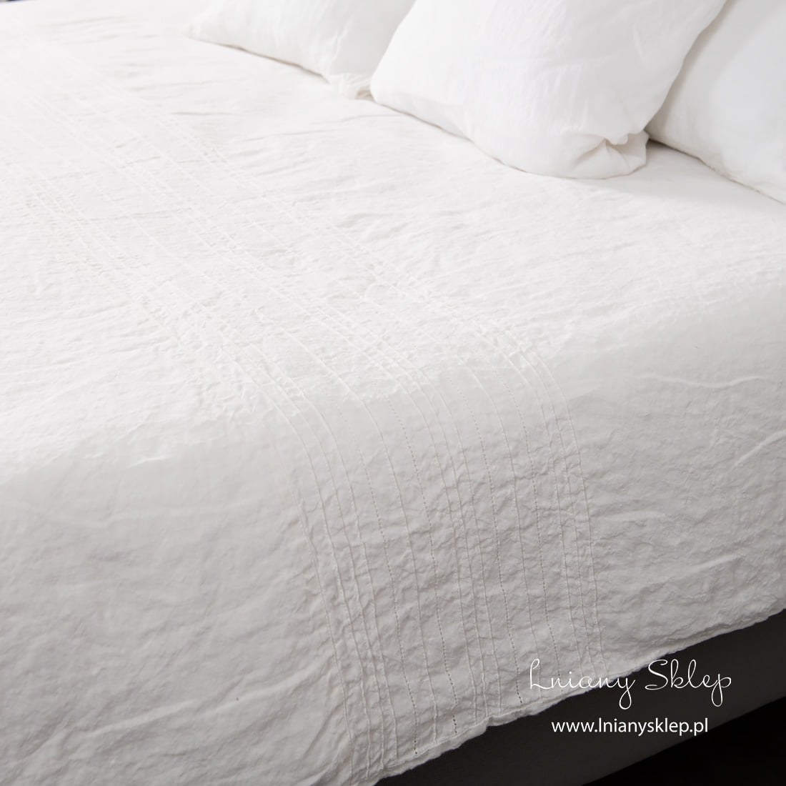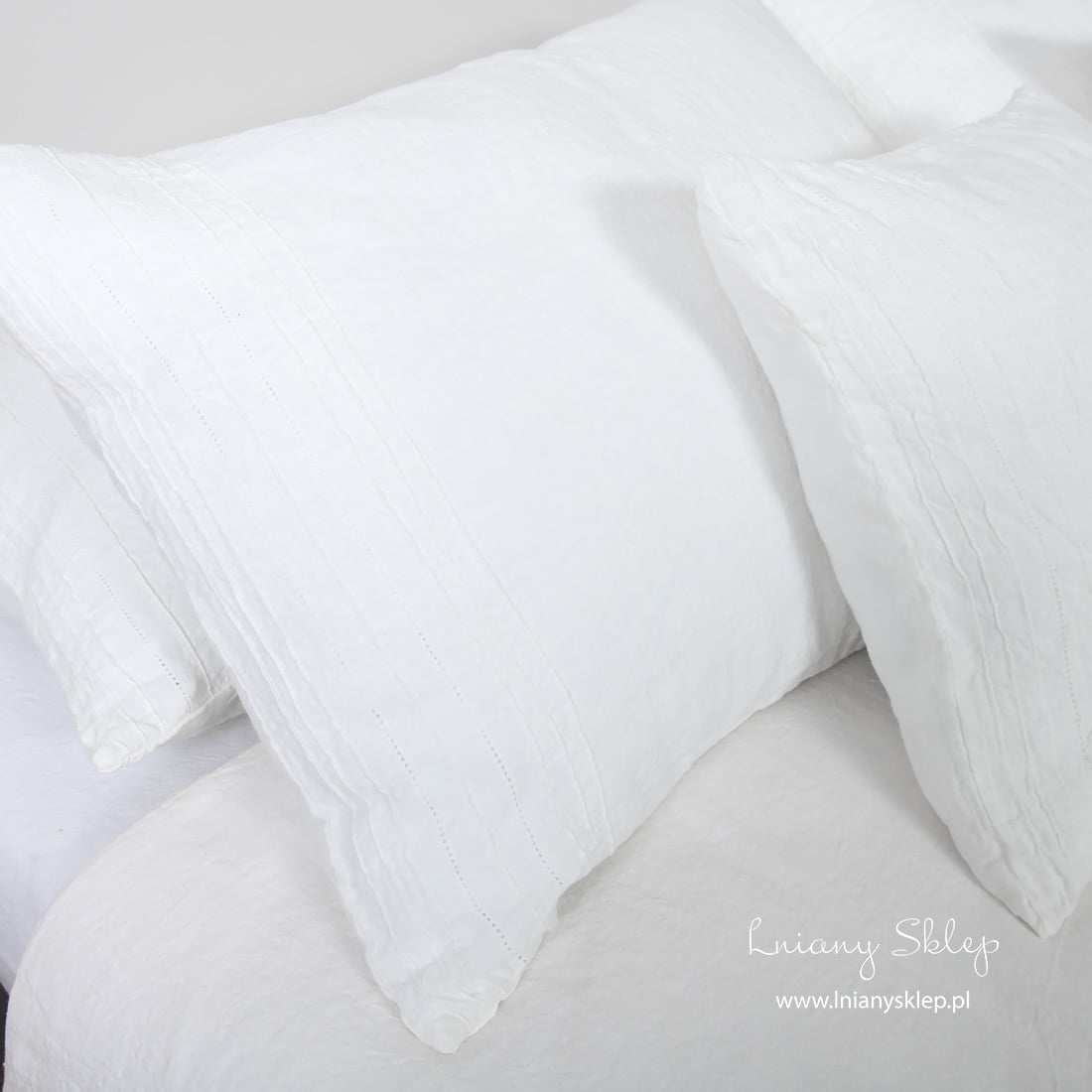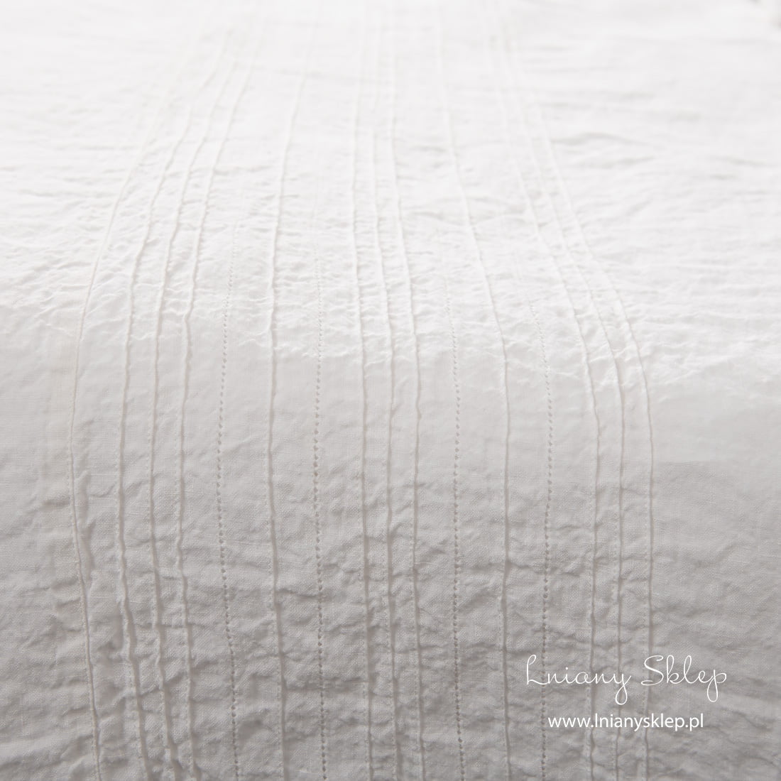 Biała pościel ozdobiona mereżką i zaszewkami 1mm (poszwy i poszewki) została uszyta z mlecznobiałej (lekko żółtawej) tkaniny lnianej. Dobraliśmy gładko tkane, mlecznobiałe prześcieradło. Tkaninę poddaliśmy praniu po to, by stała się miękka i przytulna. Po praniu tkanina uzyskała lekko gniecioną fakturę - nie potrzebuje prasowania. Subtelnie zdobiony komplet pościeli w kolorze mlecznej bieli pięknie ozdobi łóżko w Twojej sypialni!