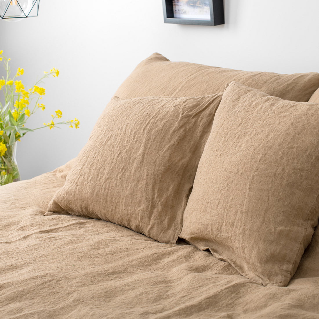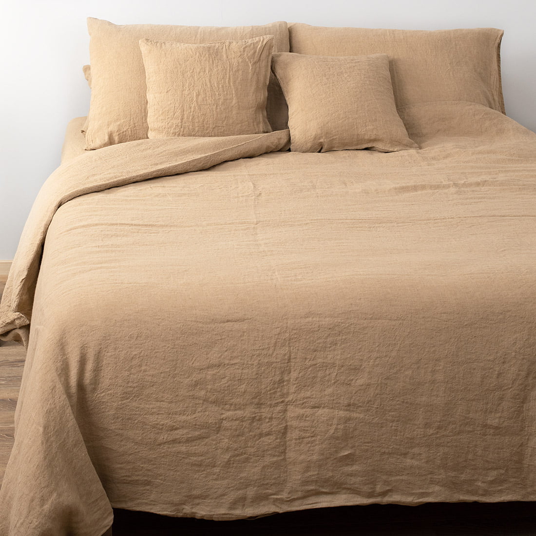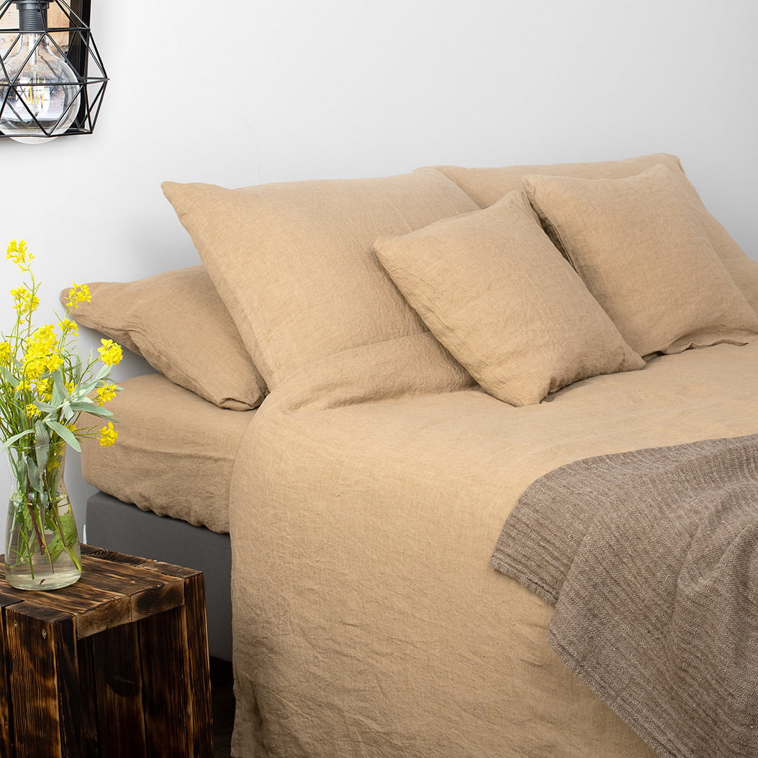 Brązowa pościel lniana „Mokka”. Na komplet składa się prześcieradło, poszwa na kołdrę i poszewka na poduszkę uszyte z pranej w procesie produkcji tkaniny lnianej w kolorze jasnej kawy z mlekiem. Produkty są miękkie, przytulne, a po kolejnych praniach nie ściągną się. Pościel należy prać w temperaturze 40 stopni. Można wirować. Można nie prasować, ponieważ pościel z pranego lnu ma na stałe nabytą lekko gniecioną fakturę. Pościel w przytulnej kolorystyce stanie się niewątpliwą ozdobą eleganckiej sypialni.