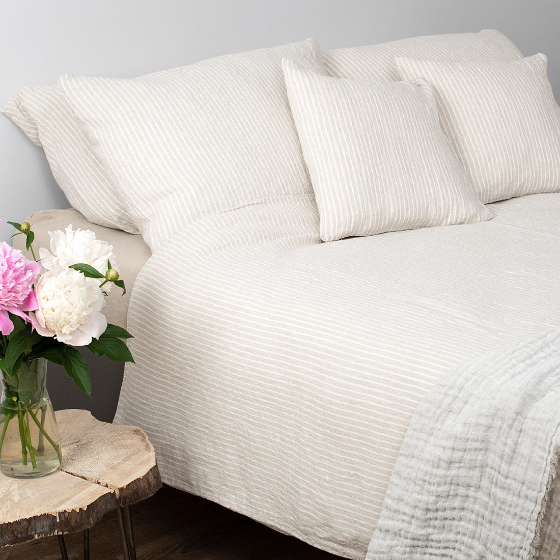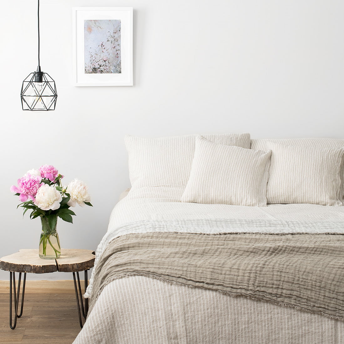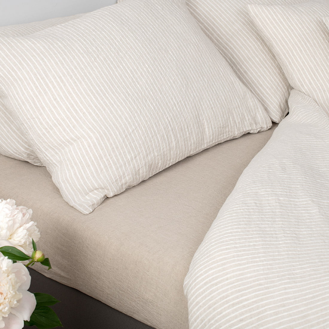Pościel lniana szara w paski „Polo” wykonana jest z pranej tkaniny lnianej wytkanej z niebarwionej i białej przędzy lnianej i ozdobionej pionowo biegnącymi białymi paskami. Prany len – idealna tkanina na bieliznę pościelową – jest mięciutki, pozwala ciału swobodnie oddychać, jest trwały. Prana tkanina nie wymaga prasowania – w czasie prania nabyła na stałe gniecioną fakturę. Wszystkie produkty wchodzące w skład kompletu „Polo” można zamówić w wymienionych albo w nietypowych - indywidualnych rozmiarach i nabyć osobno – bez pełnego kompletu.