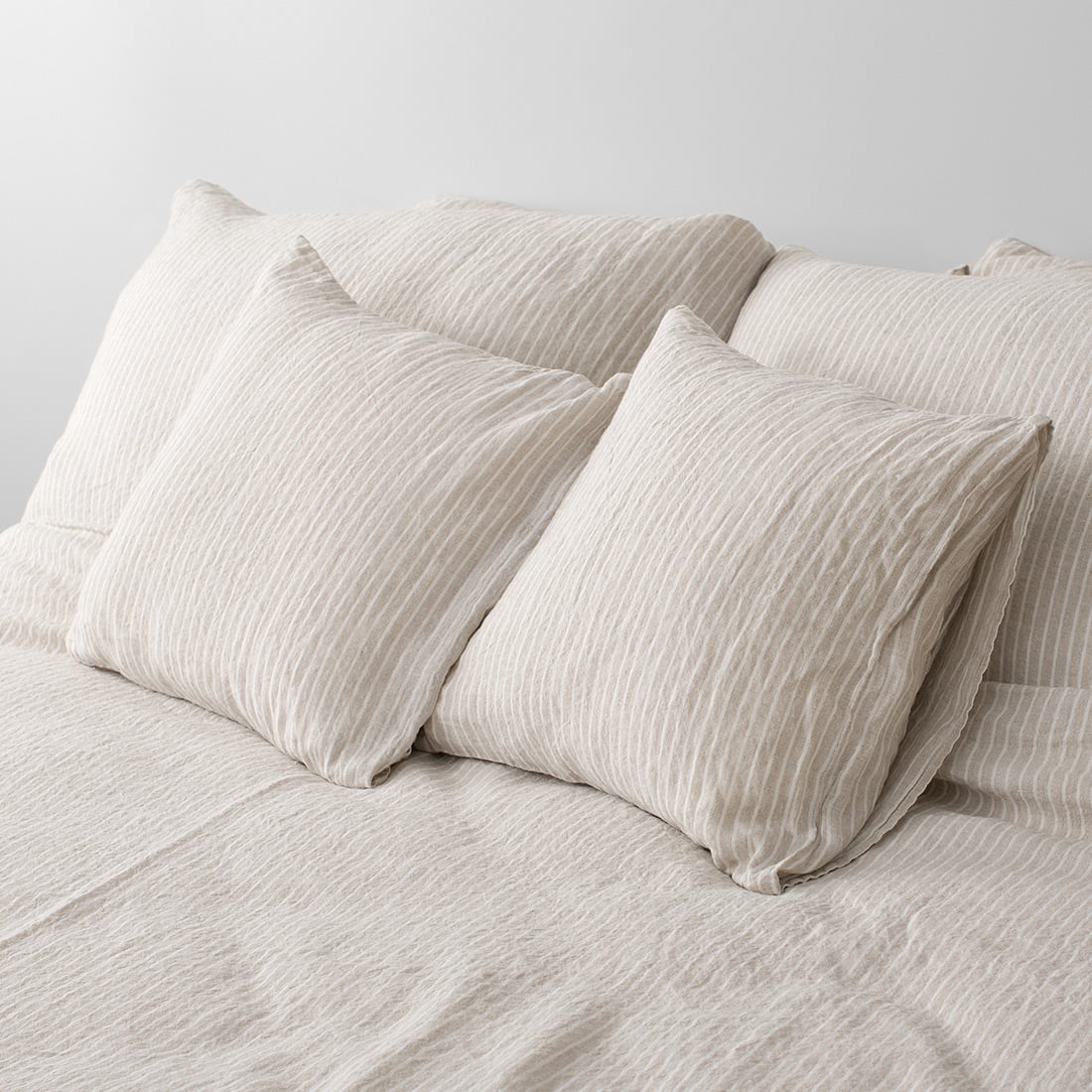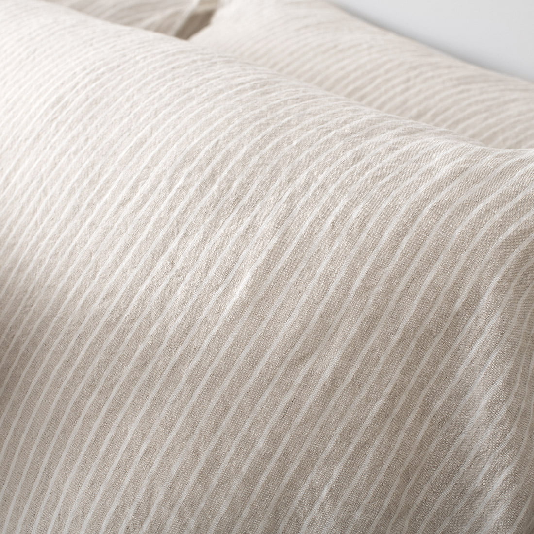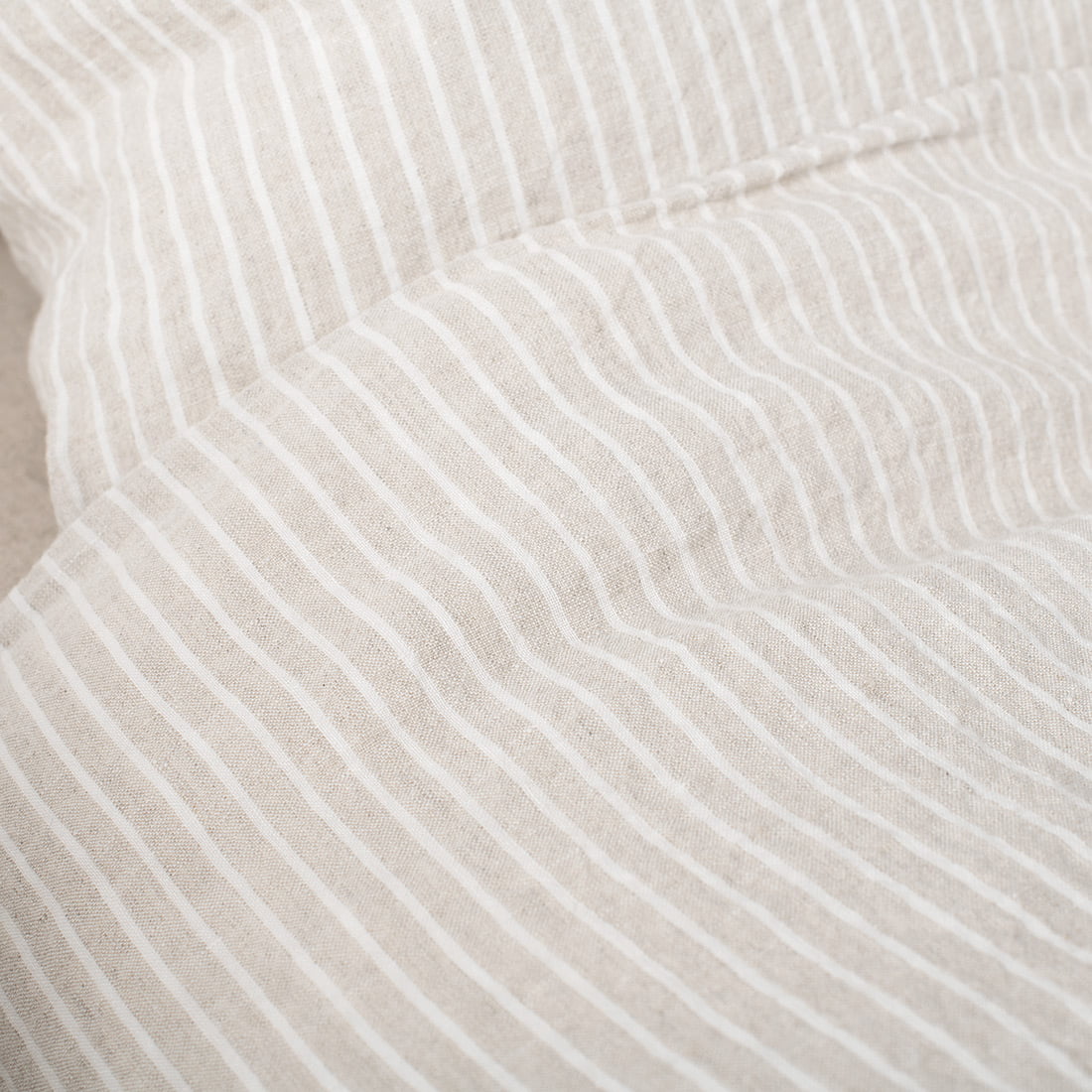 - Szara w paski poszewka na poduszkę jest szyta „na zakładkę” z boku.