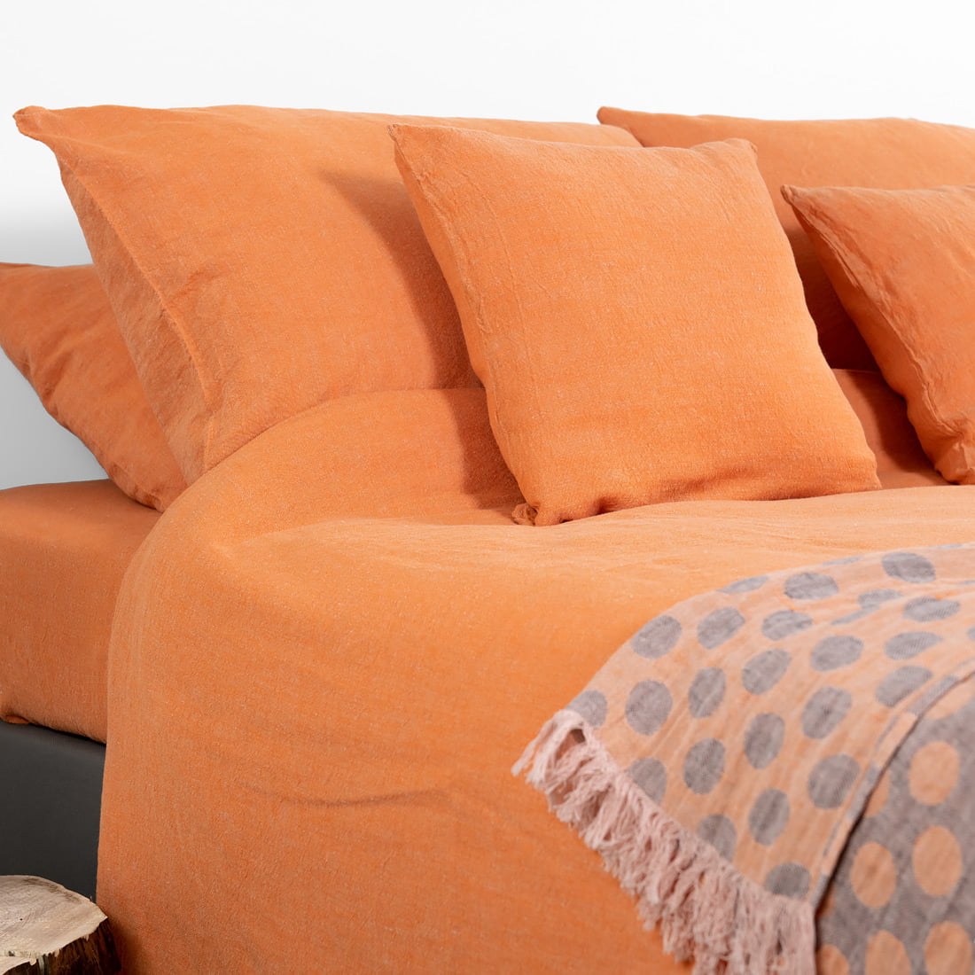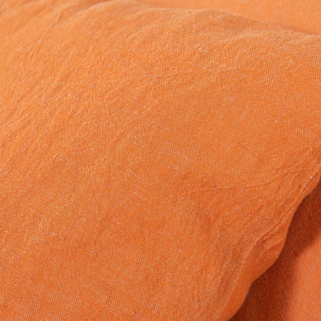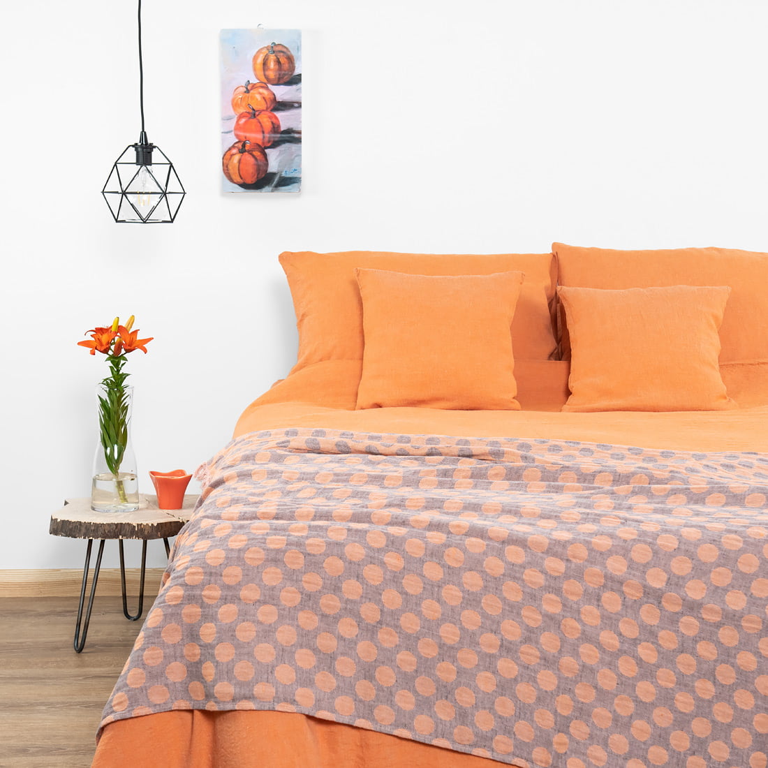Pościel lniano bawełniana pomarańczowa z tkaniny melanżowej, wytkanej z przędzy pomarańczowej bawełnianej i lnianej niebarwionej (piaskowo – szarej). Szara przędza lniana nieco wycisza intensywny pomarańczowy kolor. Obydwie przędze układaja się w przyjemny oku melanżowy rysunek. Tkanina, z której uszyliśmy tę pościel, została poddana praniu, dzięki czemu na stałe nabyła lekko gniecioną fakturę (nie potrzebuje prasowania), stała się też mięciutka i bardzo przyjemna w dotyku. Praktyczna, nowoczesna pościel z naturalnych włókien, w dość jaskrawym kolorze. Nabądź wygodną, praktyczną pościel.