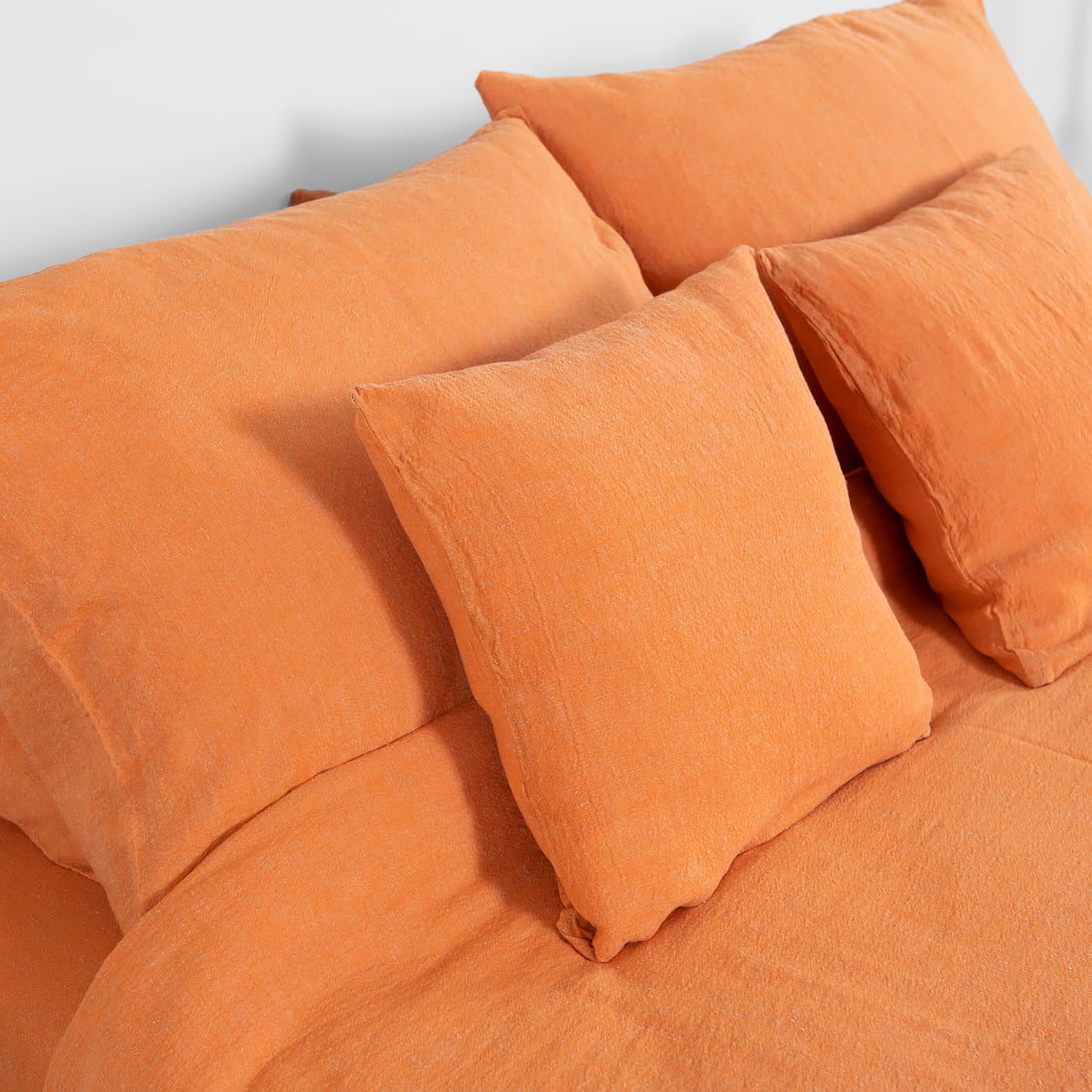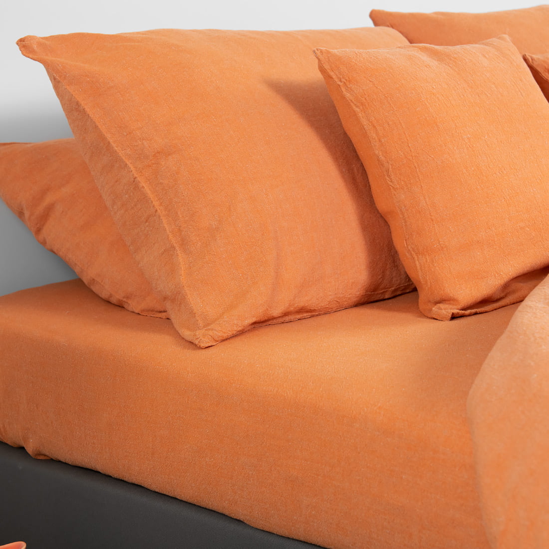 - Pomarańczowa poszewka na poduszkę jest szyta „na zakładkę” z boku.