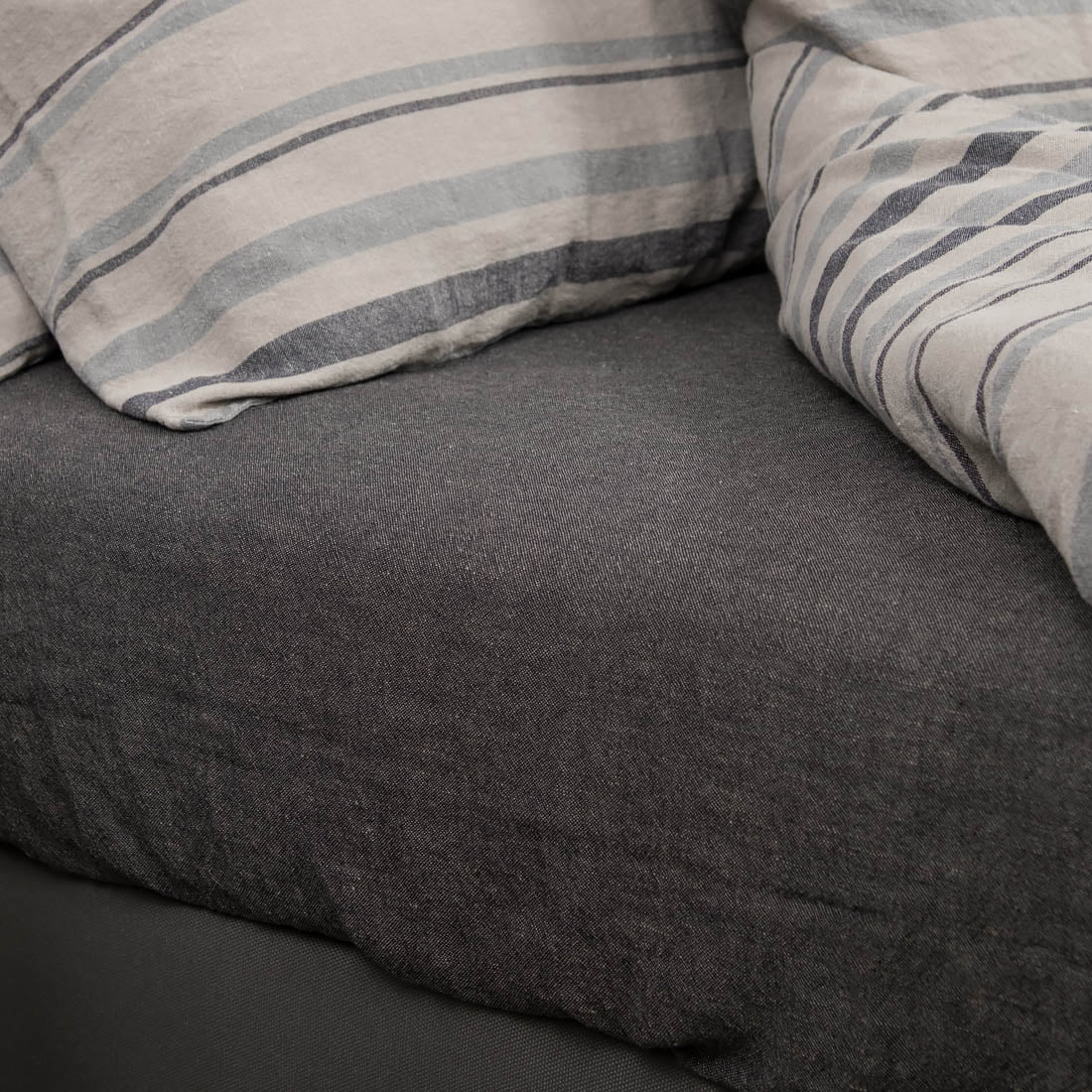 - Ciemne szare prześcieradło może być zwykle podwinięte albo wykończone gumką.