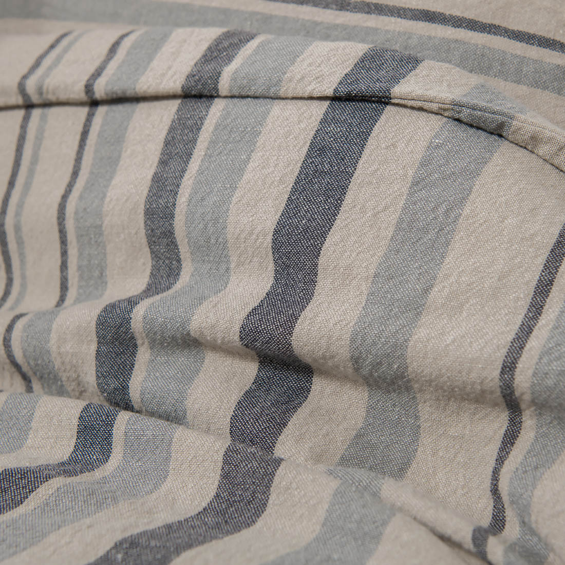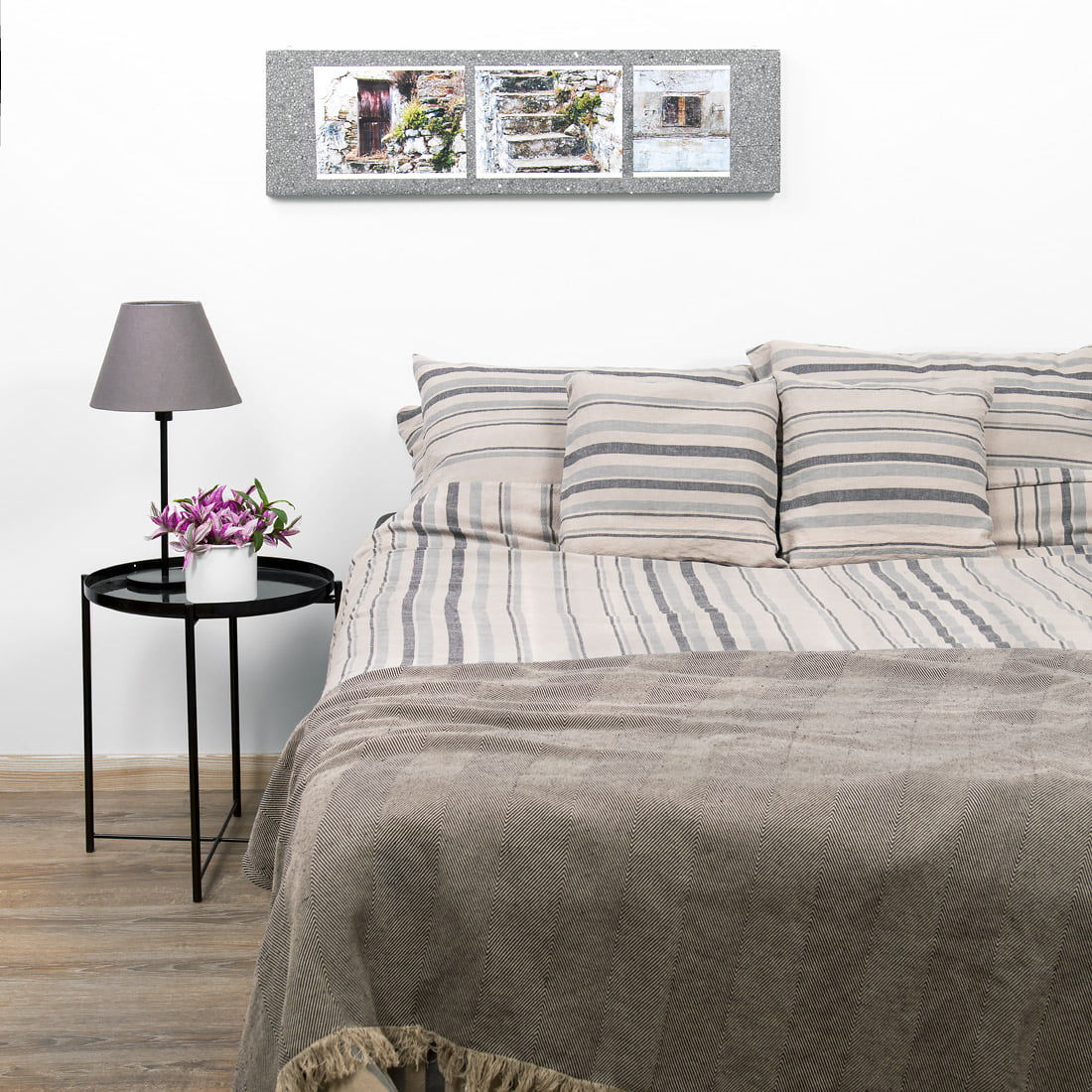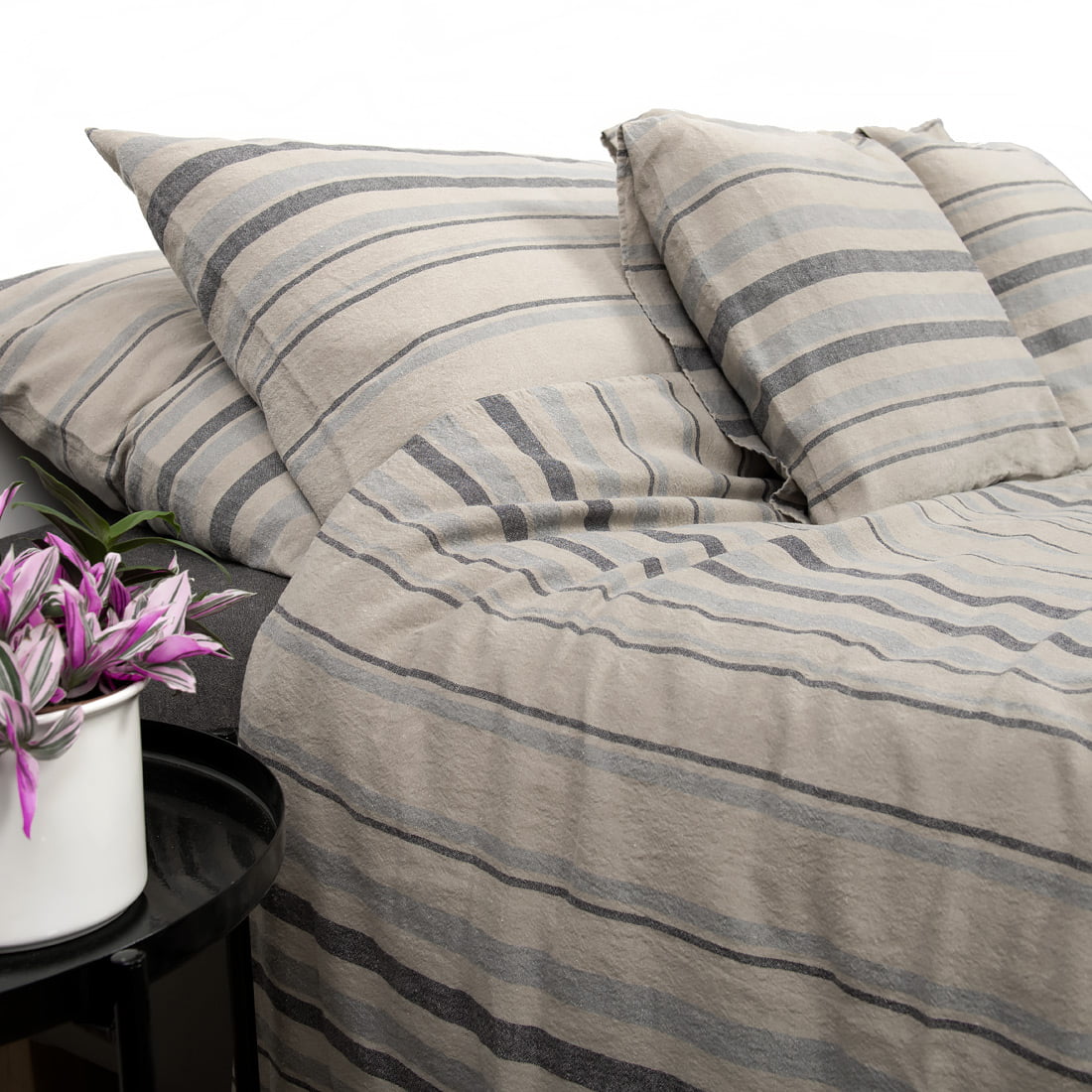 Pościel lniano bawełniana w czarne i szare paski wytkane z przędzy lnianej niebarwionej (piaskowej) i bawełnianej czarnej oraz szarej o kilku odcieniach. No komplet tej pościeli składa się poszwa i poszewka z identycznej, mięciutkiej, bo wcześniej poddanej praniu tkaniny. Ta pościel nie wymaga prasowania. Wybierz ten komplet naturalnej, stonowanej, wyciszonej pościeli.