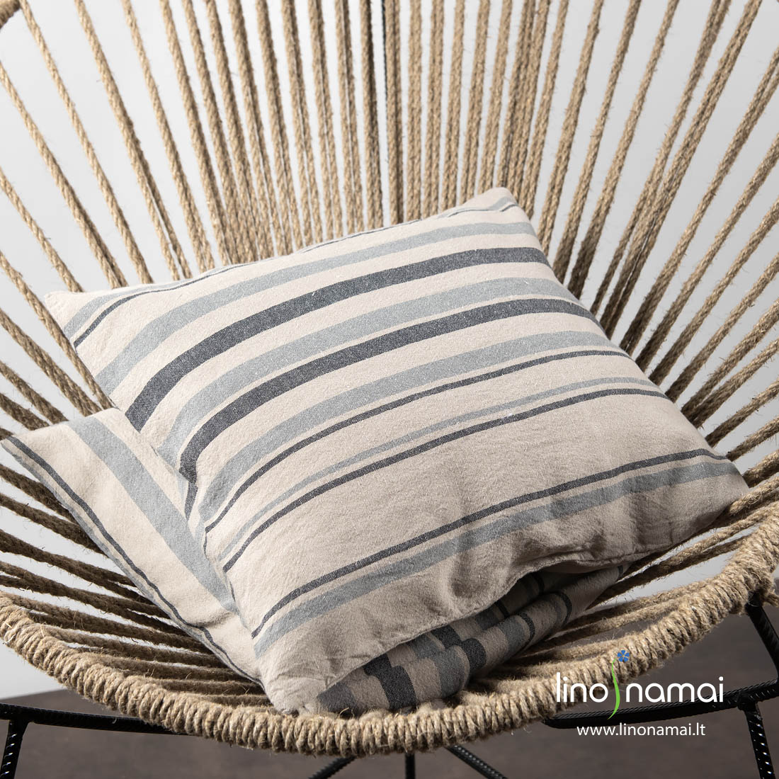 - Poszewka na poduszkę w szaro – czarne paski jest szyta „na zakładkę” z boku.