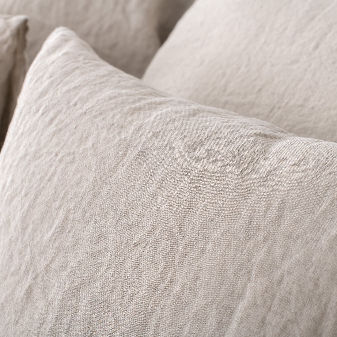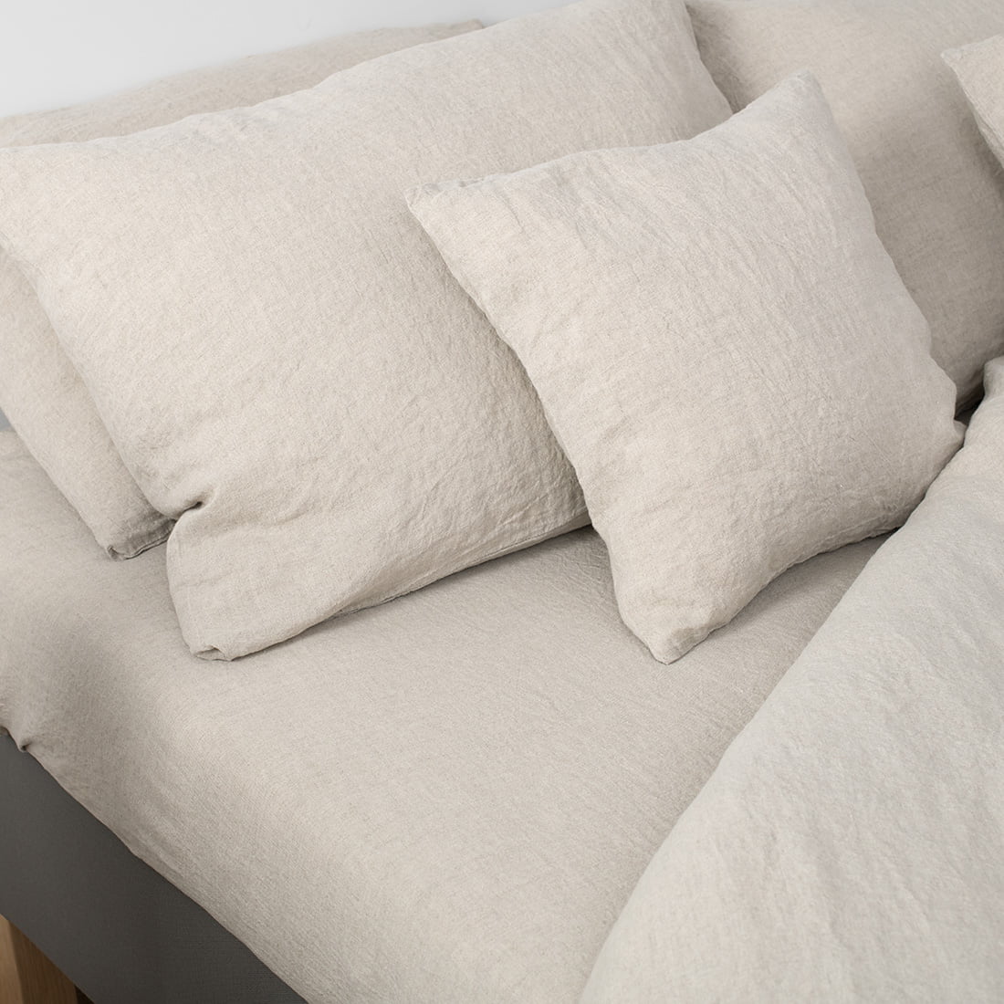 - Szara w kolorze niebarwionego lnu poszewka na poduszkę jest szyta „na zakładkę” z boku.