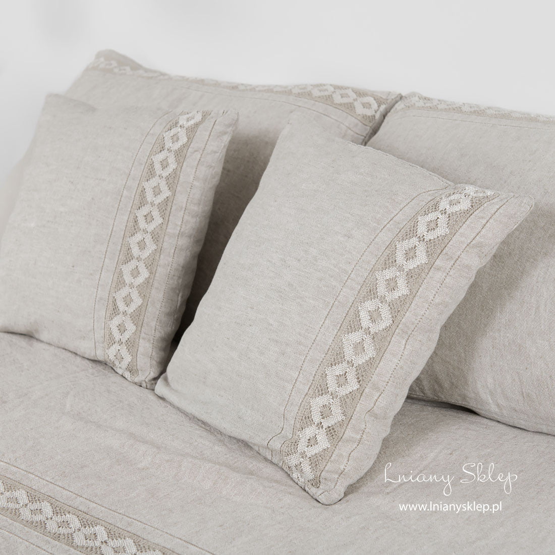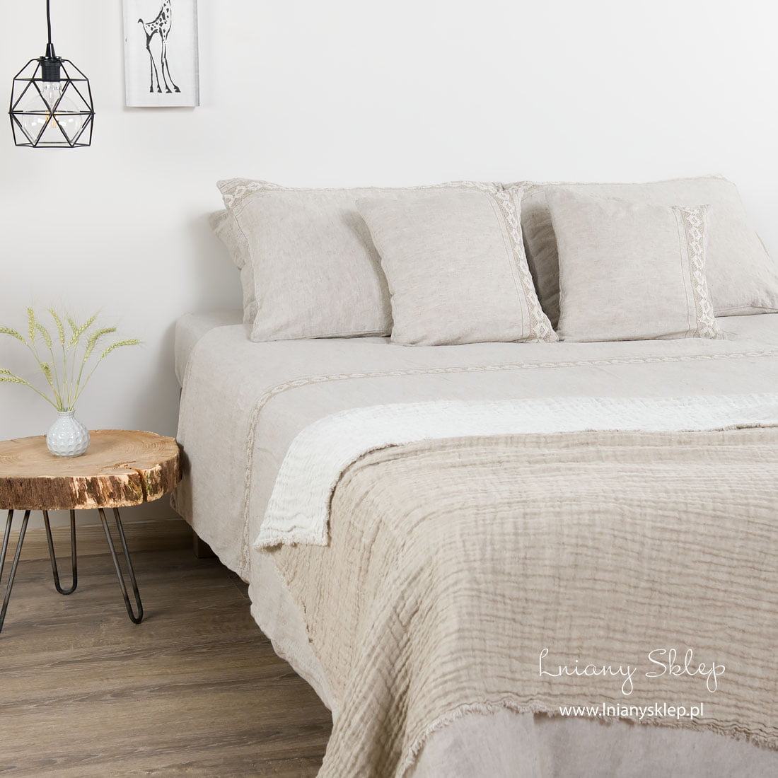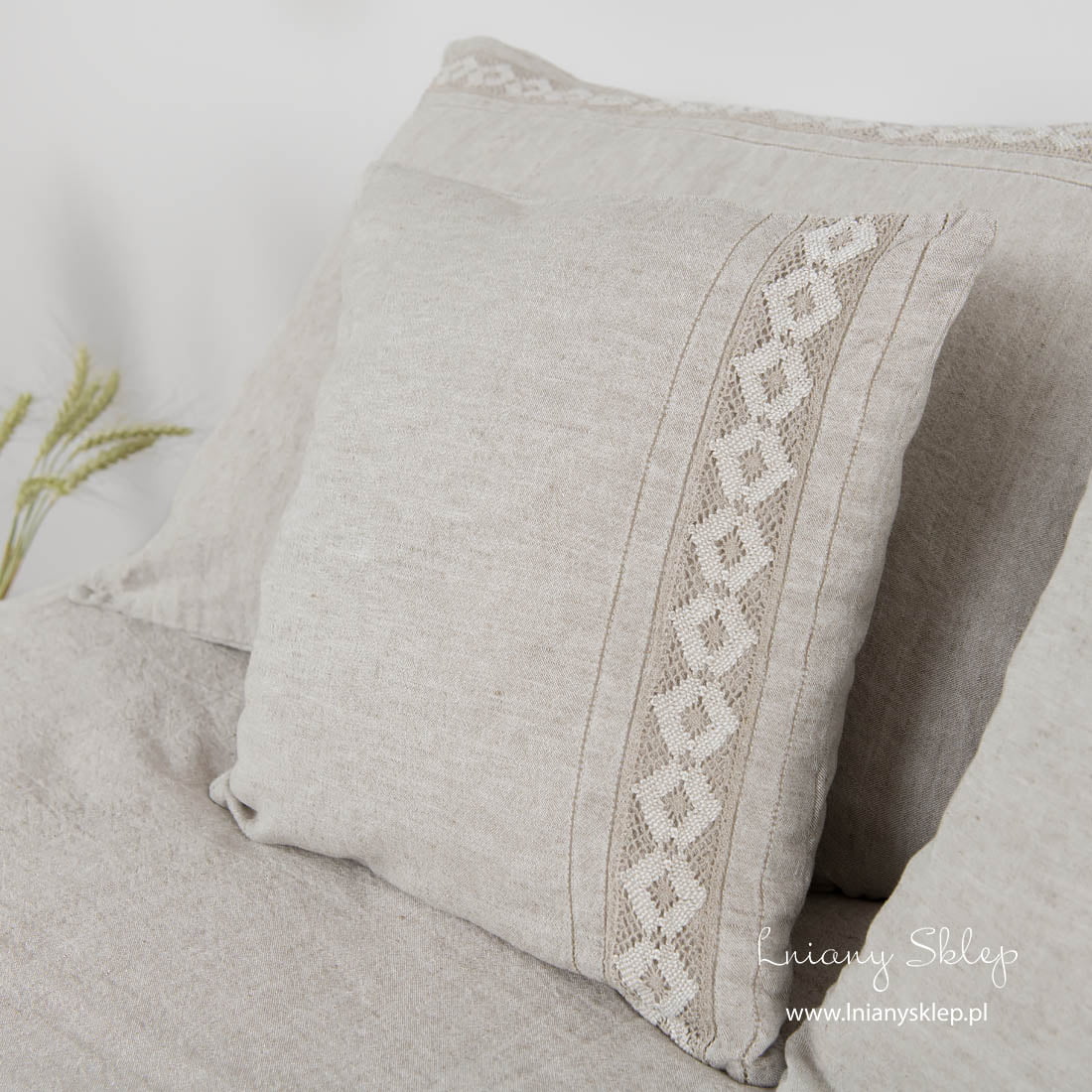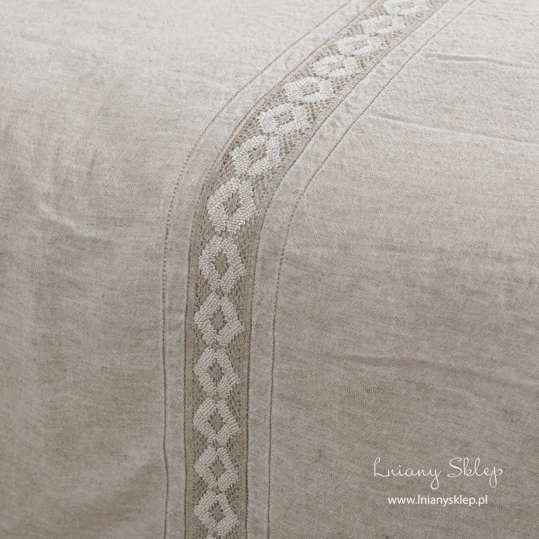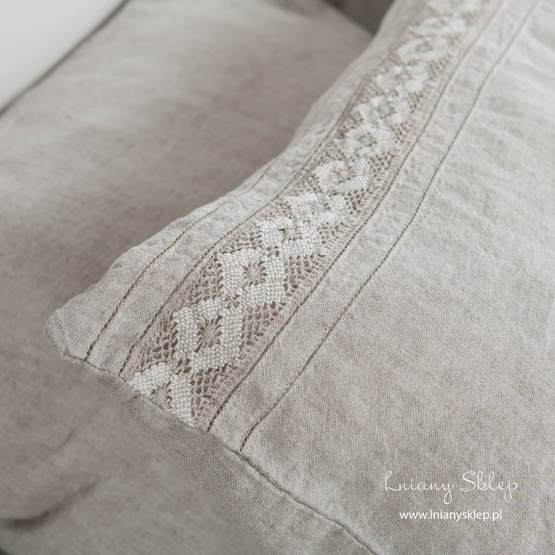 Szara pościel ozdobiona koronkami (poszwy i poszewki) została uszyta z tkaniny lniano – bawełnianej wytkanej z przędzy mlecznobiałej bawełnianej i szarej o piaskowym odcieniu lnianej. Pościel została ozdobiona delikatną koronką lnianą i mereżką po obu jej stronach. Dobralismy pasujące kolorem prześcieradło. Tkanina po poddaniu praniu uzyskała lekko gniecioną fakturę - nie potrzebuje prasowania. Subtelnie zdobiony komplet pościeli w kolorze naturalnym sprawdzi się i w Twojej sypialni, i jako pomysł na wykwintny prezent!