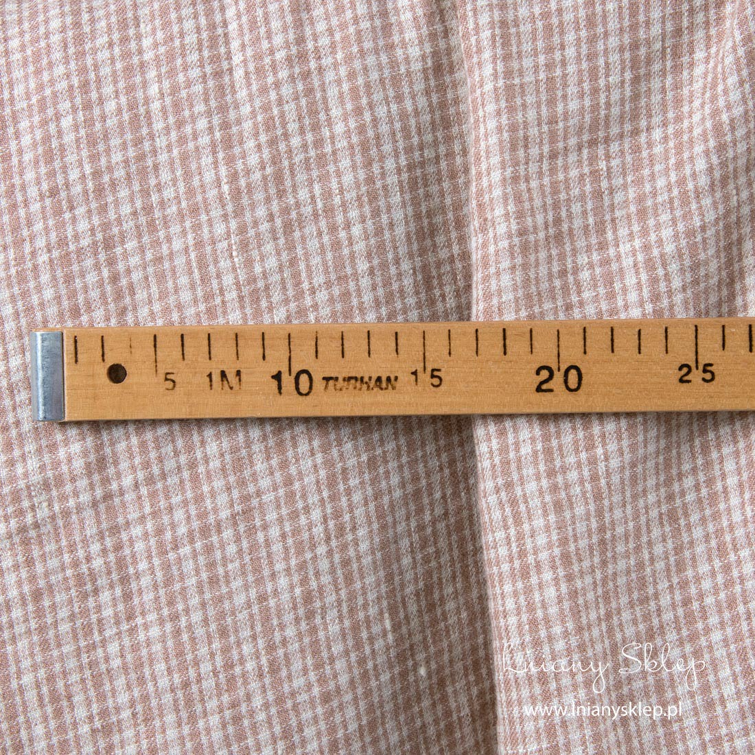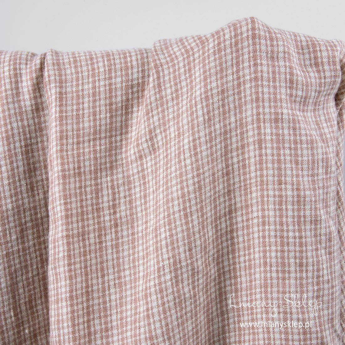 Prany len z wełną w brązową krateczkę. Wytkana z mlecznobiałej i jasnobrązowej lnianej i wełnianej przędzy. Po praniu tkanina już się nie ściągnie. Pasuje na szycie cieplejszych chust, szalików, kamizelek, pledów i in.