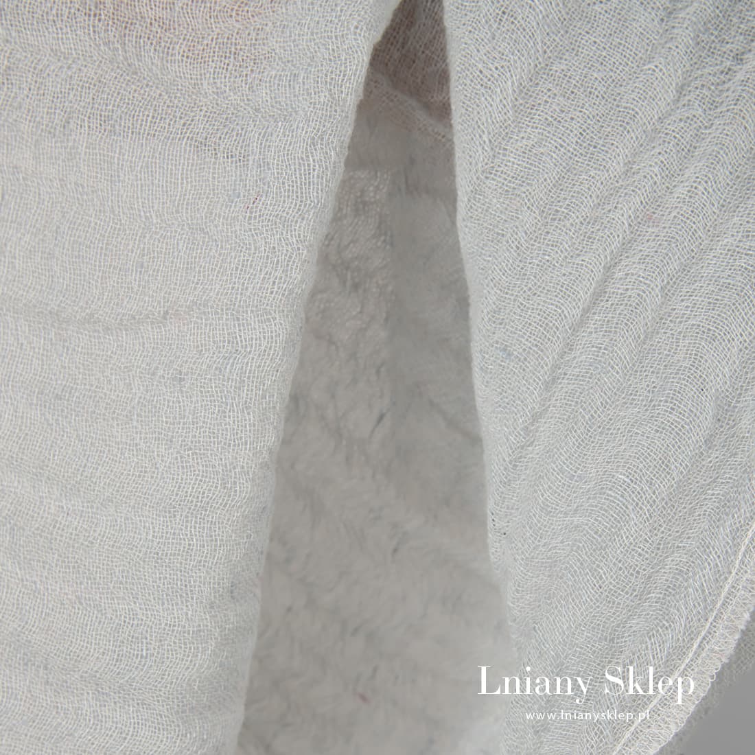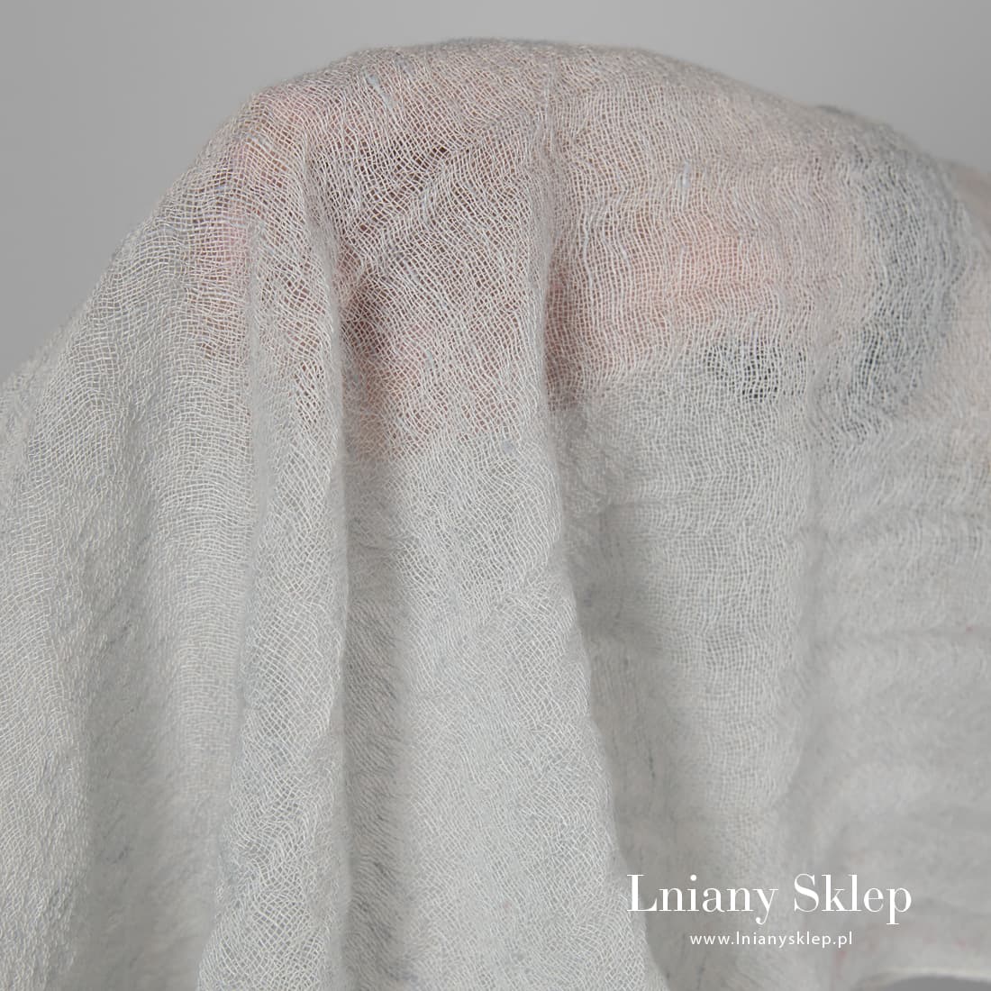 Tkanina prana odcień zieleń len z wełną wytkana jest melanżowo z przędzy lnianej jasnozielonej o niebieskawym odcieniu i wełnianej białej. Prana, mięciutka, delikatna tkanina na szycie szalików, chust, narzutek.