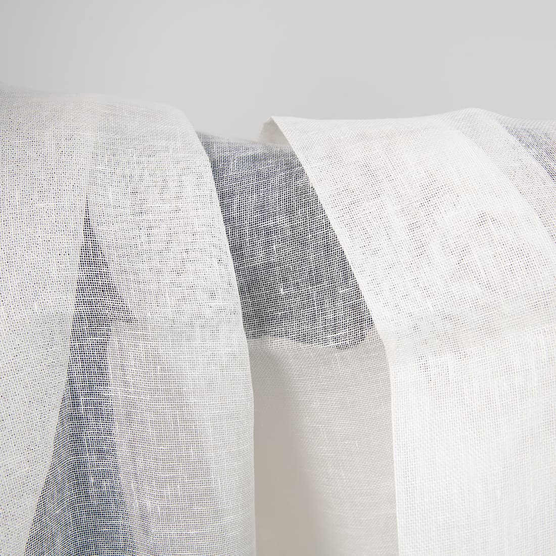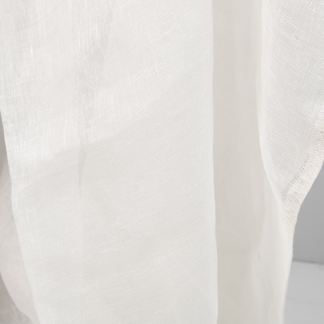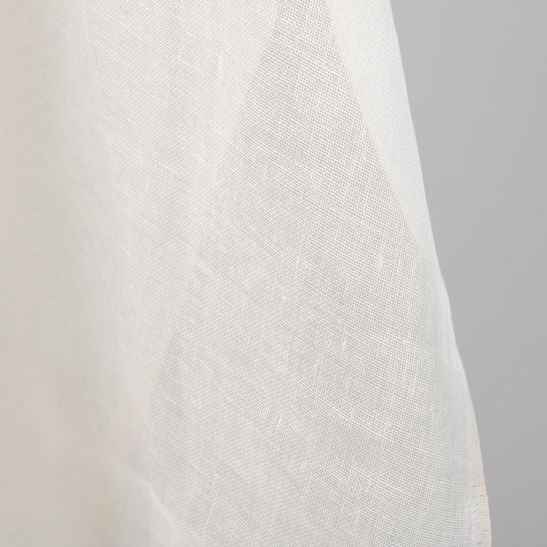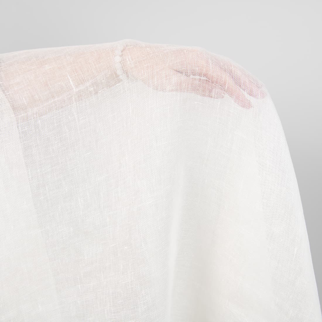 Przeźroczysta, mlecznobiała - ecru (zdecydowanie żółtawa) tkanina lniana, do wytkania której wykorzystano splot płócienny. Rzadka, leciutka, przeźroczysta tkanina świetnie się sprawdzi w szyciu firanek, szaliczków i różnych akcesoriów.