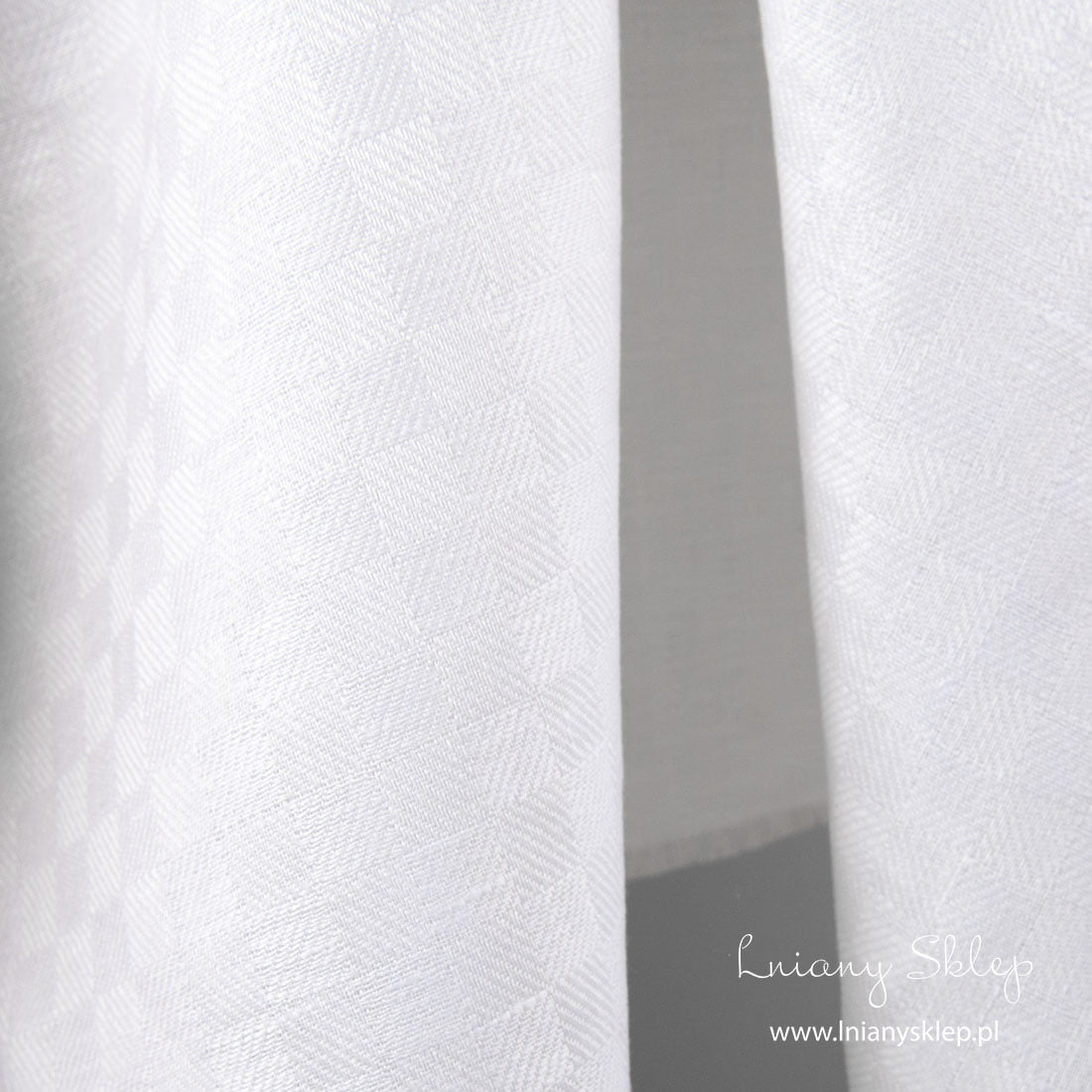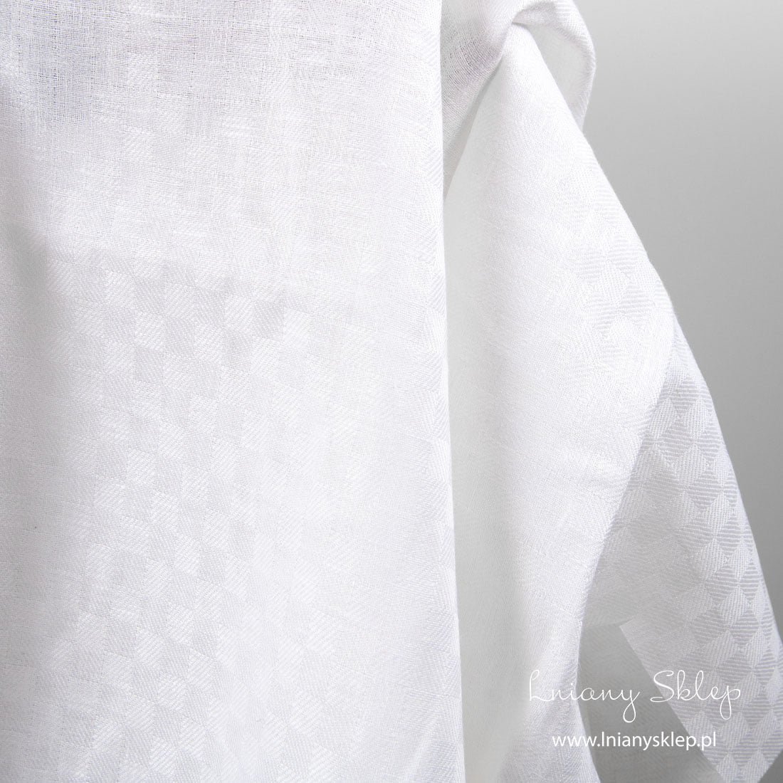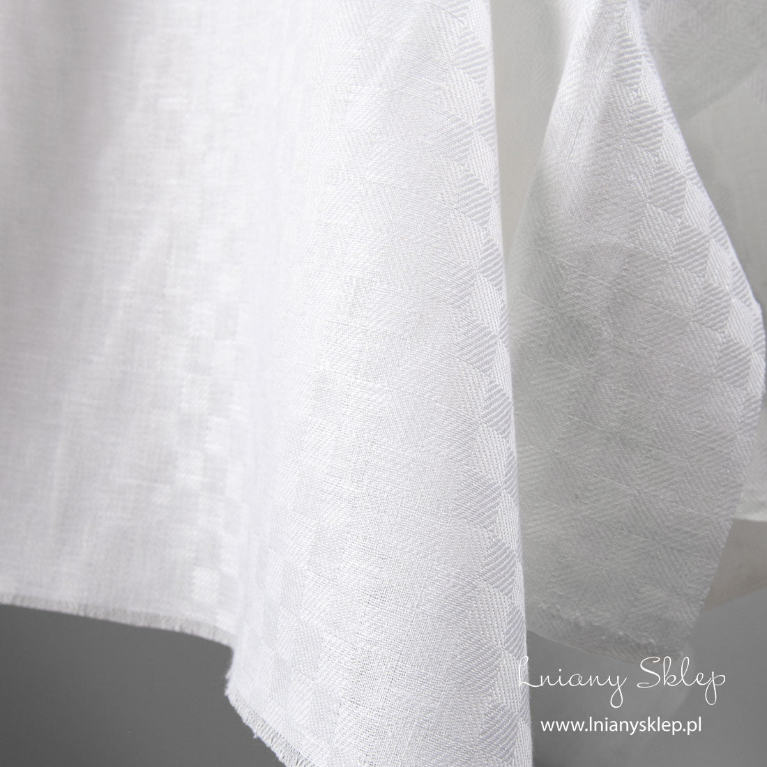 Biała tkanina lniana w krateczkę wytkana ze śnieżnobiałej przędzy w żakardową kratkę o rozmiarze 1cmx1cm. Gęsta, średnio ciężka tkanina na szycie produktów konfekcji stołowej.