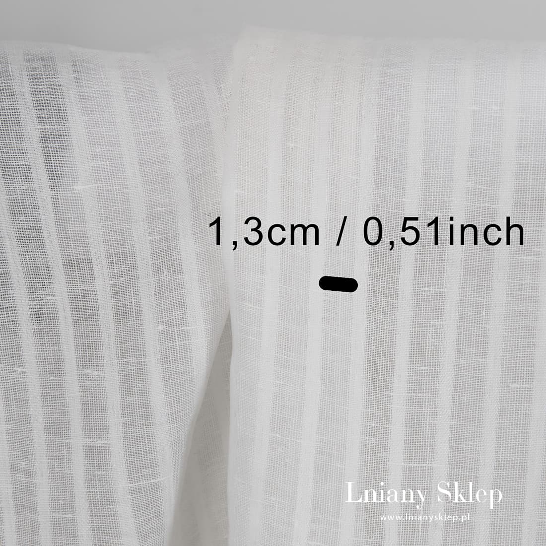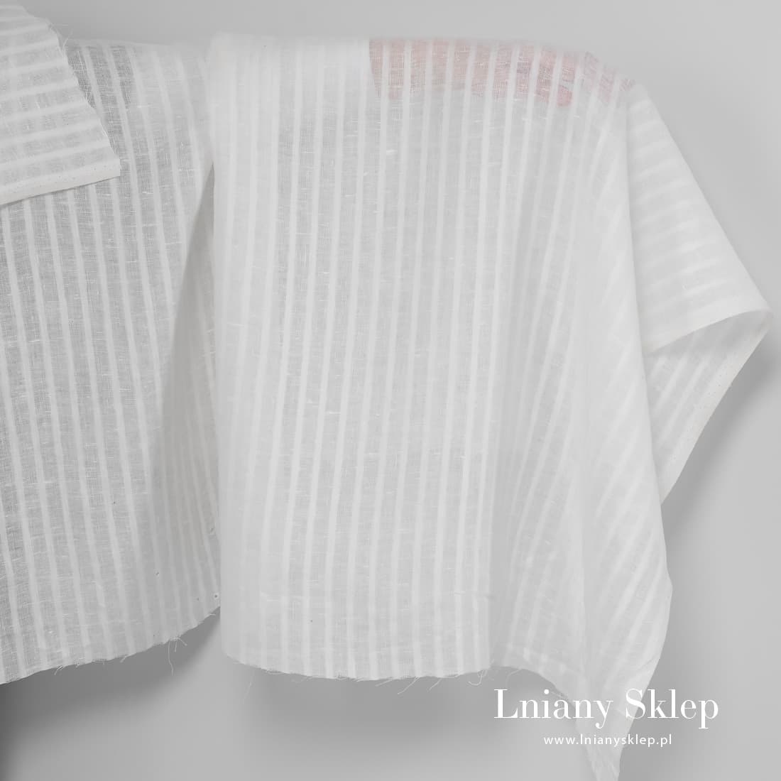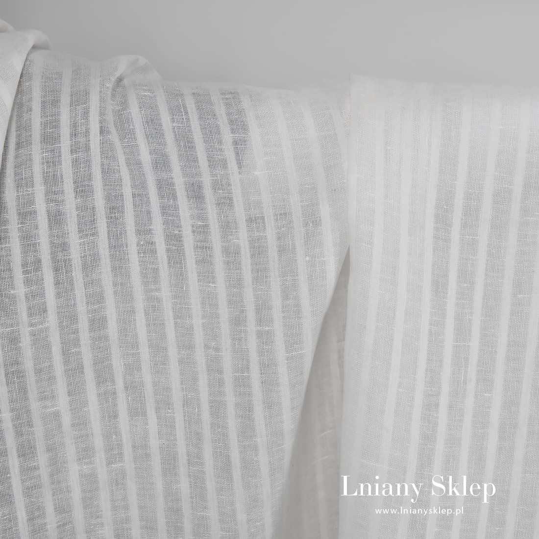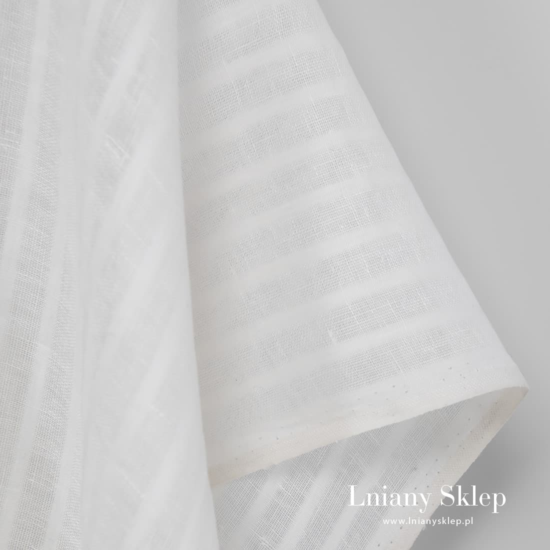 Biała tkanina w paski wytkane gęściej i rzadziej (przeźroczyście). Paski biegną pionowo. Lekka tkanina pasuje na szycie firanek, obrusów, szaliczków, chust, elementów ozdobnych, np. rękawów i in.