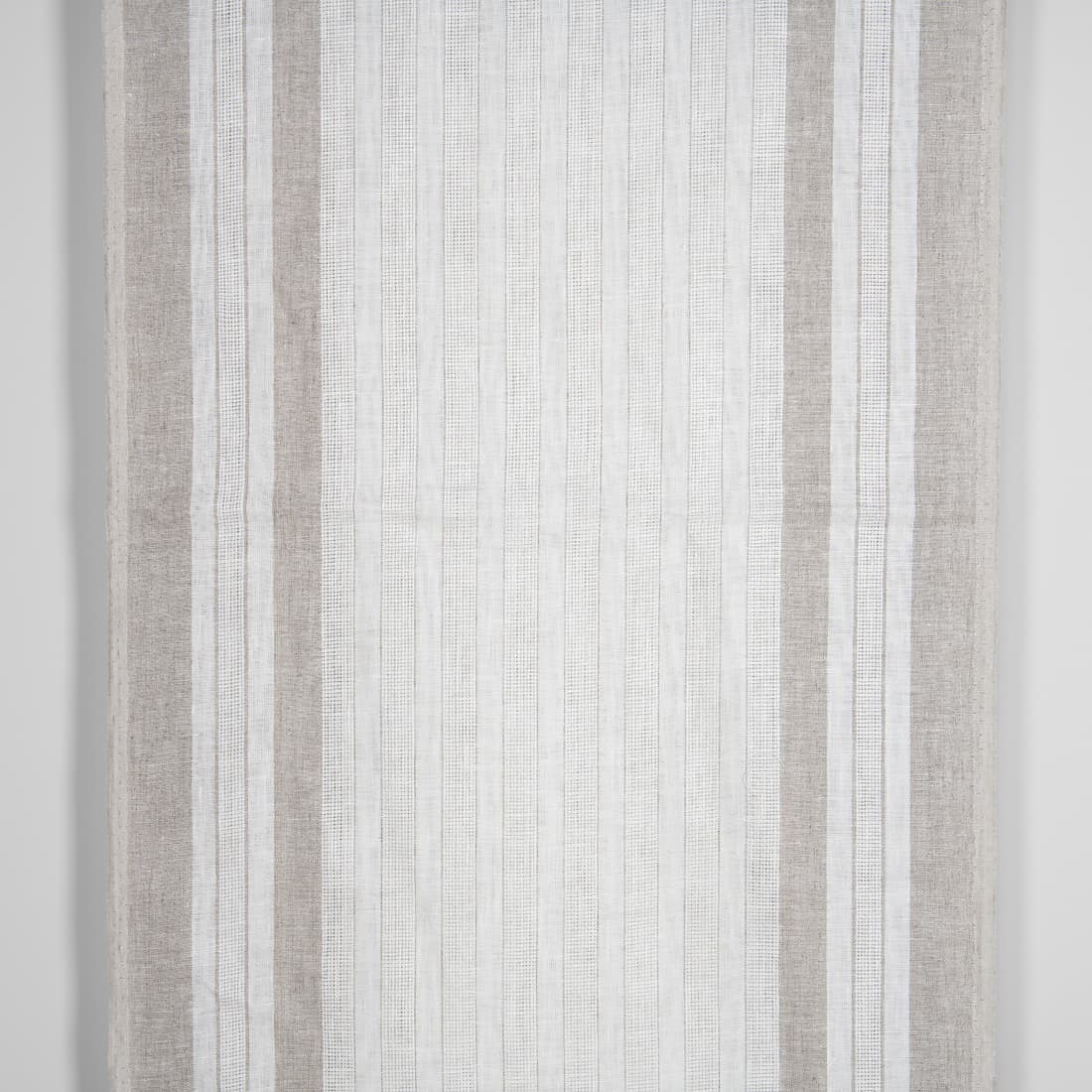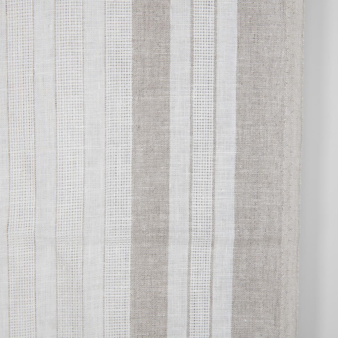 Tkanina lniana wytkana z przędzy białej i szarej. Tkanina wytkana w paski białe, szare i luźno wytkane. Tkanina do szycia konfekcji kuchennej. Świetnie wchłania wodę.